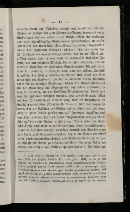 derbaren Dome und Muͤnſter, maͤchtig und wunderbar wie die Thaten der Kreuzhelden zum Himmel aufſtiegen, indem das ganze Kirchenthum wie von einem neuen Geiſte erfüllt ſich verjuͤngte und neue eigenthuͤmliche Geſtaltungen hervorbrachte, in dieſer Zeit wurde das nordoͤſtliche Deutſchland zu einem integrirenden Theile des chriſtlichen Europa's erhoben. Es war nicht das Chriſtenthum des apoſtoliſchen Zeitalters, das in die Mark ein gefuͤhrt wurde, aber es war doch ein lebenvoller kirchlicher Zu— ſtand, der den religiöſen Beduͤrfniſſen der Zeit entſprach, und im innerſten Gemuͤthe der chriſtlichen Gemeinde ſeine Wurzeln hatte. War die Richtung in Ganzen auch von der rechten Entwicklungsbahn des Geiſtes abweichend, wurde auch durch die Ver— wechslung der ſichtbaren mit der unſichtbaren Kirche unmittel— barer für die weltliche Macht und Groͤße des Kirchenthums, als fuͤr die Gruͤndung des Gottesreichs auf Erden gearbeitet, ſo war der Gewinn, der den ſlaviſchen Bewohnern der Mark aus dem Wechſel ihrer Religion erwuchs, doch unendlich groß. Was mit dem Heidenthum zu Grunde ging, war ein ungeiſtiges, ein ſinnlich⸗phantaſtiſches Religions-Ceremoniell, und was gegründet ward, war die Religion des Geiſtes und der Wahrheit, die, wenn auch in ihrem Weſen getruͤbt und auf Irrwegen begriffen, doch den Keim und die Kraft zu eigner Regeneration und zur Ruͤck— kehr auf die rechte Bahn in ſich trug. Allein wäre die chriſt— liche Kirche auch nicht in der Entwicklung jener verweltlichenden Richtung begriffen geweſen, es wuͤrde dennoch dem Prieſter jener Zeit kaum zum Vorwurfe gereichen, daß er die Slaven der Mark mehr durch prachtvollen Cultus und Buchſtabendienſt in der Ge— meinſchaft der Kirche zu erhalten, als ihnen die reine Lehre des Evangeliums auf geiſtige Weiſe auszulegen ſtrebte). Für ſolche gei