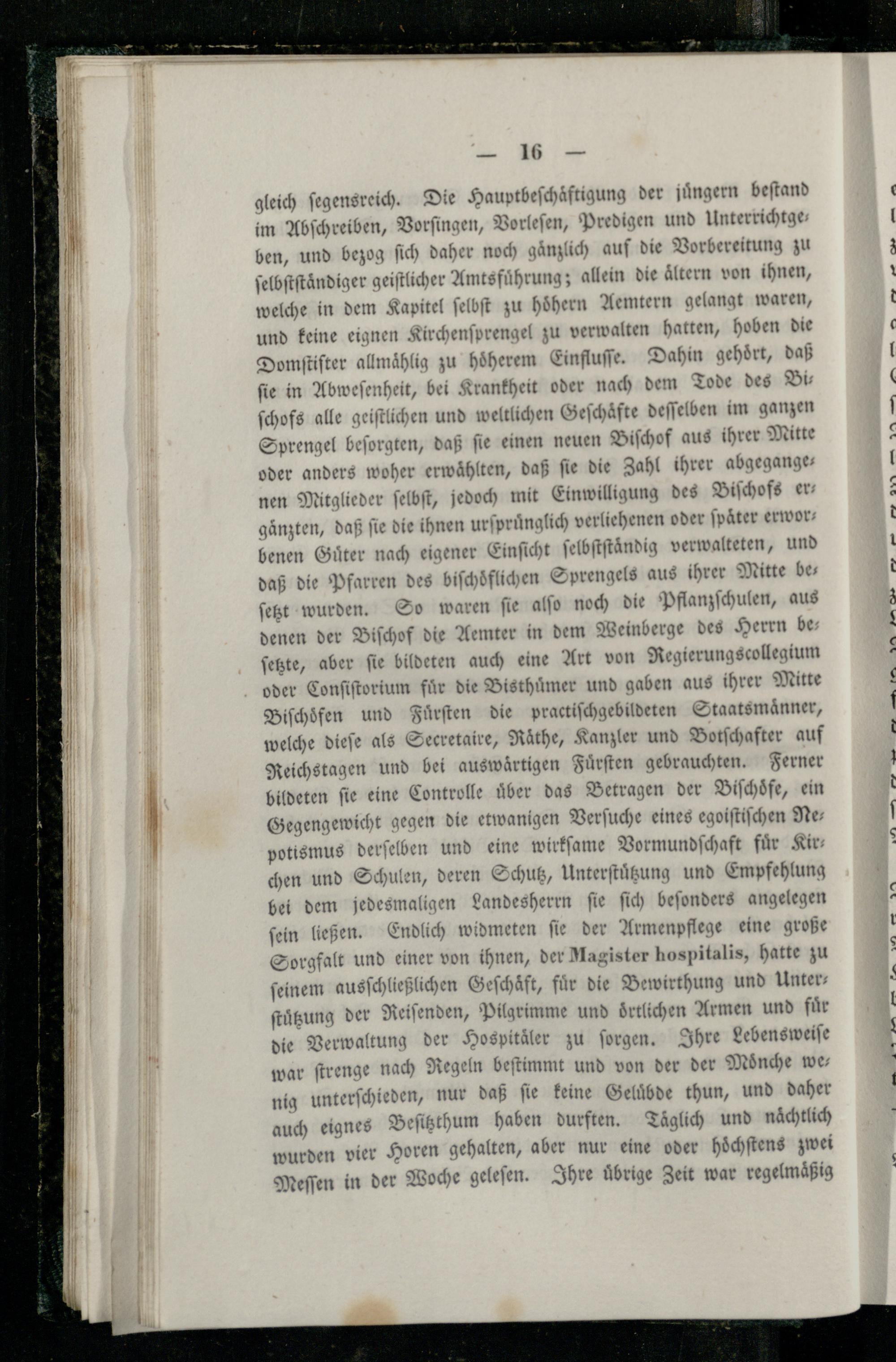 nen Mitglieder ſelbſt, jedoch mit Einwilligung des Biſchofs er— gänzten, daß fie die ihnen urſpruͤnglich verliehenen oder ſpaͤter erworbenen Guͤter nach eigener Einſicht ſelbſtſtaͤndig verwalteten, und daß die Pfarren des biſchoͤflichen Sprengels aus ihrer Mitte be— ſetzt wurden. So waren ſie alſo noch die Pflanzſchulen, aus denen der Biſchof die Aemter in dem Weinberge des Herrn be ſetzte, aber ſie bildeten auch eine Art von Regierungscollegium oder Conſiſtorium fuͤr die Bisthuͤmer und gaben aus ihrer Mitte Biſchoͤfen und Fuͤrſten die practiſchgebildeten Staatsmaͤnner, welche dieſe als Secretaire, Raͤthe, Kanzler und Botſchafter auf Reichstagen und bei auswärtigen Fuͤrſten gebrauchten. Ferner bildeten ſie eine Controlle uͤber das Betragen der Biſchoͤfe, ein Gegengewicht gegen die etwanigen Verſuche eines egoiſtiſchen Ne— potismus derſelben und eine wirkſame Vormundſchaft fuͤr Kir chen und Schulen, deren Schutz, Unterſtuͤtzung und Empfehlung bei dem jedesmaligen Landesherrn ſie ſich beſonders angelegen ſein ließen. Endlich widmeten ſie der Armenpflege eine große Sorgfalt und einer von ihnen, der Magister hospitalis, hatte zu ſeinem ausſchließlichen Geſchaͤft, fuͤr die Bewirthung und Unter— ſtuͤtzung der Reiſenden, Pilgrimme und oͤrtlichen Armen und fuͤr