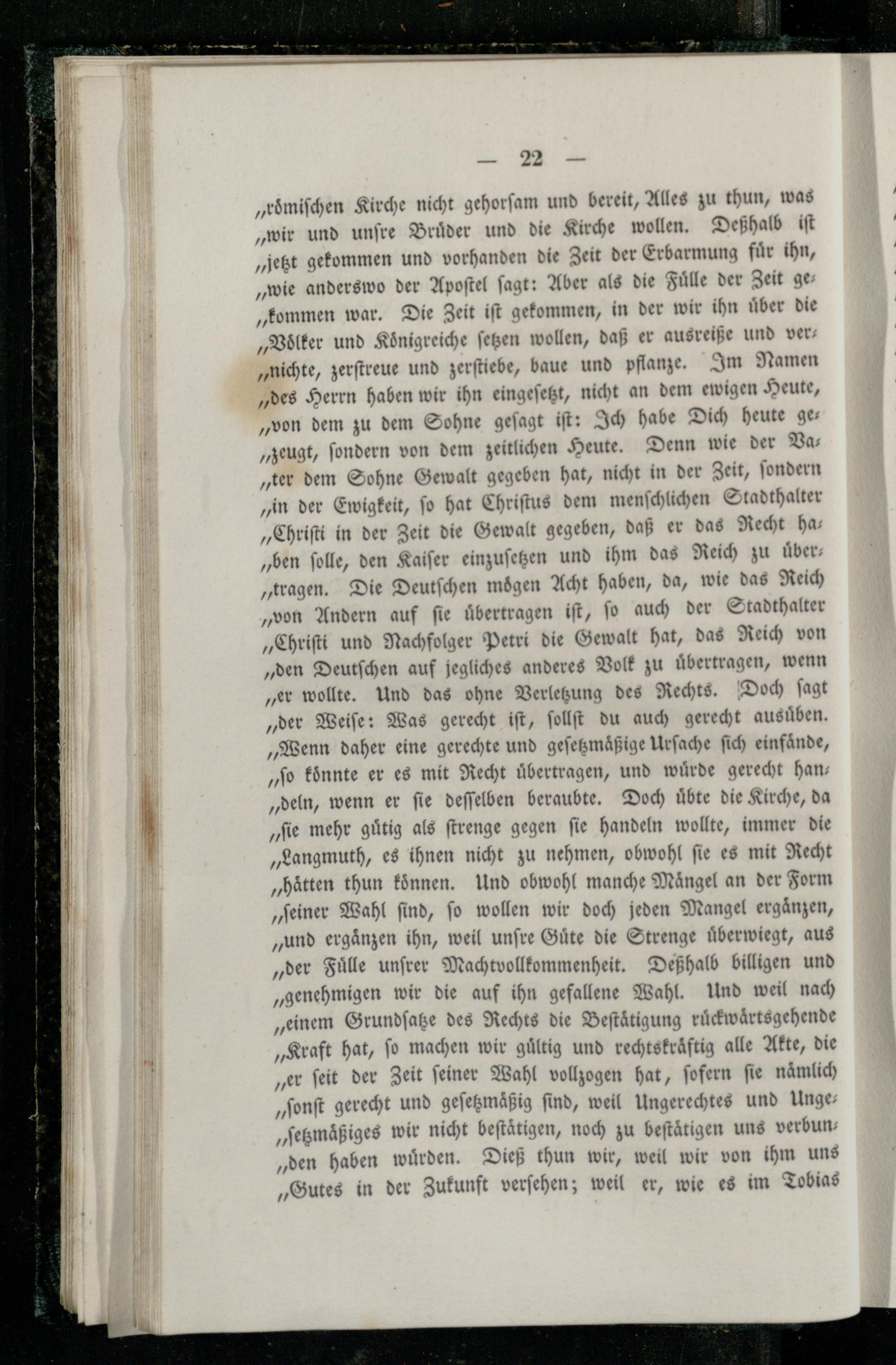 „roͤmiſchen Kirche nicht gehorſam und bereit, Alles zu thun, was „wir und unſre Bruͤder und die Kirche wollen. Deßhalb iſt „jetzt gekommen und vorhanden die Zeit der Erbarmung für ihn, „wie anderswo der Apoſtel ſagt: Aber als die Fülle der Zeit ge „kommen war. Die Zeit iſt gekommen, in der wir ihn uͤber die „Voͤlker und Königreiche ſetzen wollen, daß er ausreiße und ver; „nichte, zerſtreue und zerſtiebe, baue und pflanze. Im Namen „des Herrn haben wir ihn eingeſetzt, nicht an dem ewigen Heute, „von dem zu dem Sohne geſagt iſt: Ich habe Dich heute ge— „zeugt, ſondern von dem zeitlichen Heute. Denn wie der Va— „ter dem Sohne Gewalt gegeben hat, nicht in der Zeit, ſondern „in der Ewigkeit, ſo hat Chriſtus dem menſchlichen Stadthalter „Chriſti in der Zeit die Gewalt gegeben, daß er das Recht has „ben ſolle, den Kaiſer einzuſetzen und ihm das Reich zu Über- „tragen. Die Deutſchen mögen Acht haben, da, wie das Reich „von Andern auf ſie uͤbertragen iſt, ſo auch der Stadthalter „Chriſti und Nachfolger Petri die Gewalt hat, das Reich von „den Deutſchen auf jegliches anderes Volk zu uͤbertragen, wenn „er wollte. Und das ohne Verletzung des Rechts. Doch ſagt „der Weiſe: Was gerecht iſt, ſollſt du auch gerecht ausüben, „Wenn daher eine gerechte und geſetzmaͤßige Urſache ſich einfände, „ſo koͤnnte er es mit Recht uͤbertragen, und wuͤrde gerecht han— „deln, wenn er ſie deſſelben beraubte. Doch uͤbte die Kirche, da „ſie mehr guͤtig als ſtrenge gegen ſie handeln wollte, immer die „Langmuth, es ihnen nicht zu nehmen, obwohl ſie es mit Recht „haͤtten thun koͤnnen. Und obwohl manche Mängel an der Form „ſeiner Wahl ſind, ſo wollen wir doch jeden Mangel ergänzen, „und ergänzen ihn, weil unſre Güte die Strenge überwiegt, aus „der Fülle unſrer Machtvollkommenheit. Deßhalb billigen und „genehmigen wir die auf ihn gefallene Wahl. Und weil nach „einem Grundſatze des Rechts die Beſtäͤtigung ruͤckwaͤrtsgehende „Kraft hat, fo machen wir gültig und rechtskräftig alle Akte, die „er ſeit der Zeit ſeiner Wahl vollzogen hat, ſofern ſie nämlich „ſonſt gerecht und geſetzmaͤßig find, weil Ungerechtes und Unge„ſetzmaͤßiges wir nicht beſtaͤtigen, noch zu beſtaͤtigen uns verbun— „den haben wuͤrden. Dieß thun wir, weil wir von ihm uns „Gutes in der Zukunft verſehen; weil er, wie es im Tobias
