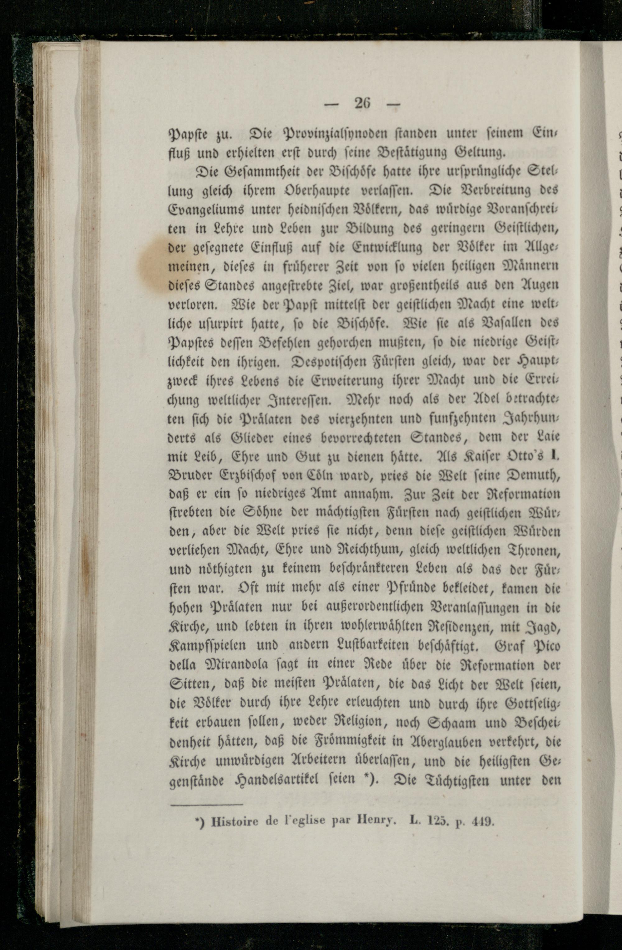 Die Geſammtheit der Biſchoͤfe hatte ihre urſpruͤngliche Stel lung gleich ihrem Oberhaupte verlaſſen. Die Verbreitung des Evangeliums unter heidniſchen Völkern, das wuͤrdige Voranſchrei ten in Lehre und Leben zur Bildung des geringern Geiſtlichen, der geſegnete Einfluß auf die Entwicklung der Volker im Allge meinen, dieſes in früherer Zeit von fo vielen heiligen Männern dieſes Standes angeſtrebte Ziel, war großentheils aus den Augen verloren. Wie der Papſt mittelſt der geiſtlichen Macht eine welt— liche uſurpirt hatte, fo die Biſchoͤfe. Wie fie als Vaſallen des Papſtes deſſen Befehlen gehorchen mußten, ſo die niedrige Geiſt— lichkeit den ihrigen. Despotiſchen Fuͤrſten gleich, war der Haupt— zweck ihres Leben die Erweiterung ihrer Macht und die Errei— chung weltlicher Intereſſen. Mehr noch als der Adel betrachte ten ſich die Praͤlaten des vierzehnten und funfzehnten Jahrhun derts als Glieder eines bevorrechteten Standes, dem der Laie mit Leib, Ehre und Gut zu dienen haͤtte. Als Kaiſer Otto's J. Bruder Erzbiſchof von Coͤln ward, pries die Welt ſeine Demuth, daß er ein ſo niedriges Amt annahm. Zur Zeit der Reformation ſtrebten die Söhne der mäͤchtigſten Fuͤrſten nach geiſtlichen Wuͤr— den, aber die Welt pries fie nicht, denn dieſe geiſtlichen Würden verliehen Macht, Ehre und Reichthum, gleich weltlichen Thronen, und noͤthigten zu keinem beſchraͤnkteren Leben als das der Fuͤr ſten war. Oft mit mehr als einer Pfruͤnde bekleidet, kamen die hohen Praͤlaten nur bei außerordentlichen Veranlaſſungen in die Kirche, und lebten in ihren wohlerwaͤhlten Reſidenzen, mit Jagd, Kampfſpielen und andern Luſtbarkeiten beſchaͤftigt. Graf Pico della Mirandola ſagt in einer Rede uͤber die Reformation der Sitten, daß die meiſten Praͤlaten, die das Licht der Welt ſeien, die Voͤlker durch ihre Lehre erleuchten und durch ihre Gottſelig— keit erbauen ſollen, weder Religion, noch Schaam und Beſchei denheit haͤtten, daß die Froͤmmigkeit in Aberglauben verkehrt, die Kirche unwuͤrdigen Arbeitern uͤberlaſſen, und die heiligſten Ge— genſtaͤnde Handelsartikel ſeien). Die Tuͤchtigſten unter den