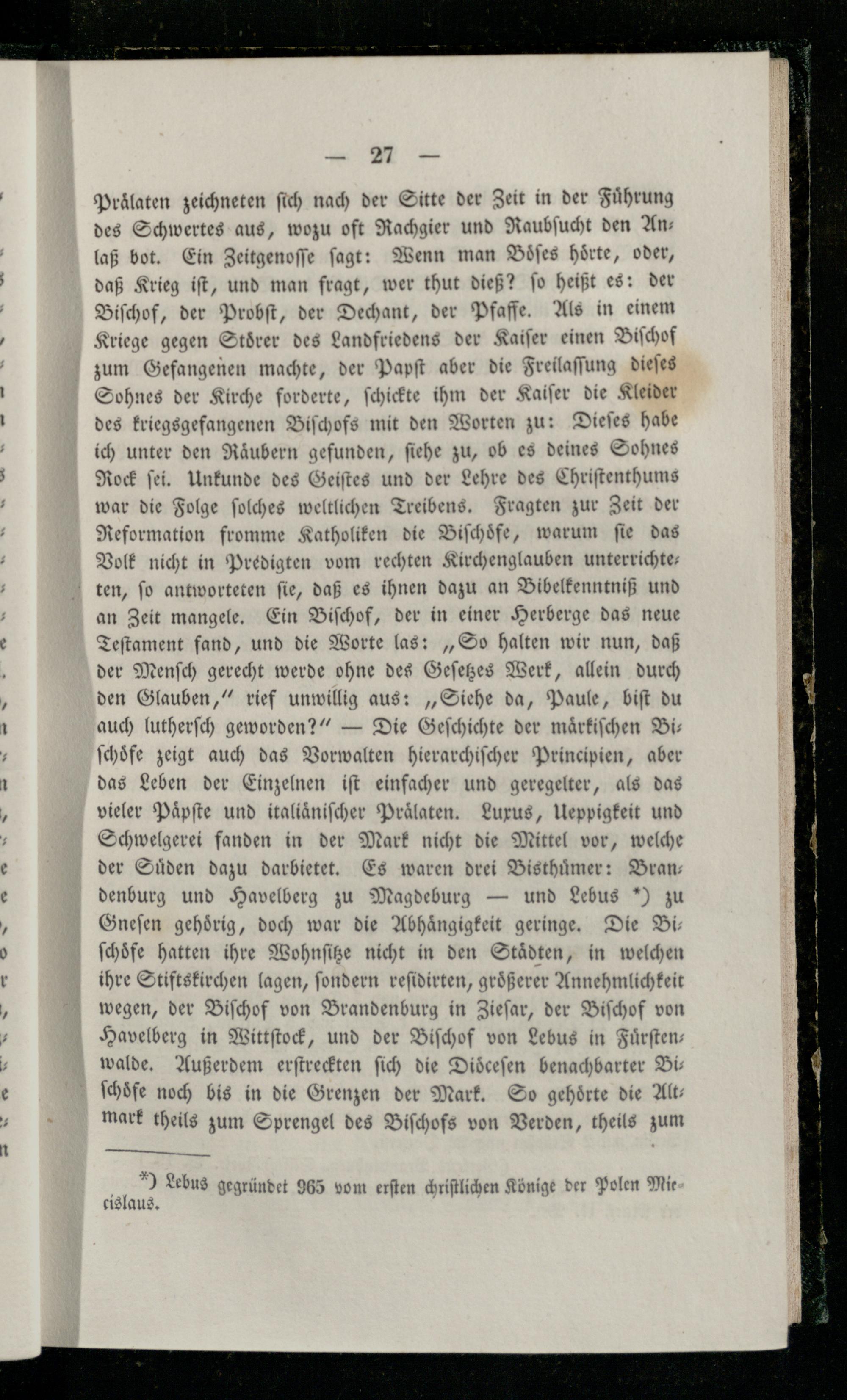 Praͤlaten zeichneten ſich nach der Sitte der Zeit in der Fuͤhrung des Schwertes aus, wozu oft Rachgier und Raubſucht der Anlaß bot. Ein Zeitgenoſſe ſagt: Wenn man Boͤſes hoͤrte, oder, daß Krieg iſt, und man fragt, wer thut dieß? ſo heißt es: der Biſchof, der Probſt, der Dechant, der Pfaffe. Als in einem Kriege gegen Stoͤrer des Landfriedens der Kaiſer einen Biſchof zum Gefangenen machte, der Papſt aber die Freilaſſung dieſes Sohnes der Kirche forderte, ſchickte ihm der Kaiſer die Kleider des kriegsgefangenen Biſchofs mit den Worten zu: Dieſes habe ich unter den Raͤubern gefunden, ſiehe zu, ob es deines Sohnes Rock ſei. Unkunde des Geiſtes und der Lehre des Chriſtenthums war die Folge ſolches weltlichen Treibens. Fragten zur Zeit der Reformation fromme Katholiken die Biſchoͤfe, warum fie das Volk nicht in Predigten vom rechten Kirchenglauben unterrichte— ten, ſo antworteten ſie, daß es ihnen dazu an Bibelkenntniß und an Zeit mangele. Ein Biſchof, der in einer Herberge das neue Teſtament fand, und die Worte las:„So halten wir nun, daß der Menſch gerecht werde ohne des Geſetzes Werk, allein durch den Glauben,“ rief unwillig aus:„Siehe da, Paule, biſt du auch lutherſch geworden?“— Die Geſchichte der maͤrkiſchen Bi— ſchoͤfe zeigt auch das Vorwalten hierarchiſcher Principien, aber das Leben der Einzelnen iſt einfacher und geregelter, als das vieler Paͤpſte und italiaͤniſcher Praͤlaten. Luxus, Ueppigkeit und Schwelgerei fanden in der Mark nicht die Mittel vor, welche der Suͤden dazu darbietet. Es waren drei Bisthuͤmer: Bran— denburg und Havelberg zu Magdeburg— und Lebus“) zu Gneſen gehoͤrig, doch war die Abhaͤngigkeit geringe. Die Bi ſchoͤfe hatten ihre Wohnſitze nicht in den Staͤdten, in welchen ihre Stiftskirchen lagen, ſondern reſidirten, groͤßerer Annehmlichkeit wegen, der Biſchof von Brandenburg in Zieſar, der Biſchof von Havelberg in Wittſtock, und der Biſchof von Lebus in Fuͤrſten— walde. Außerdem erſtreckten ſich die Diöceſen benachbarter Bi— ſchoͤfe noch bis in die Grenzen der Mark. So gehoͤrte die Alt— mark theils zum Sprengel des Biſchofs von Verden, theils zum