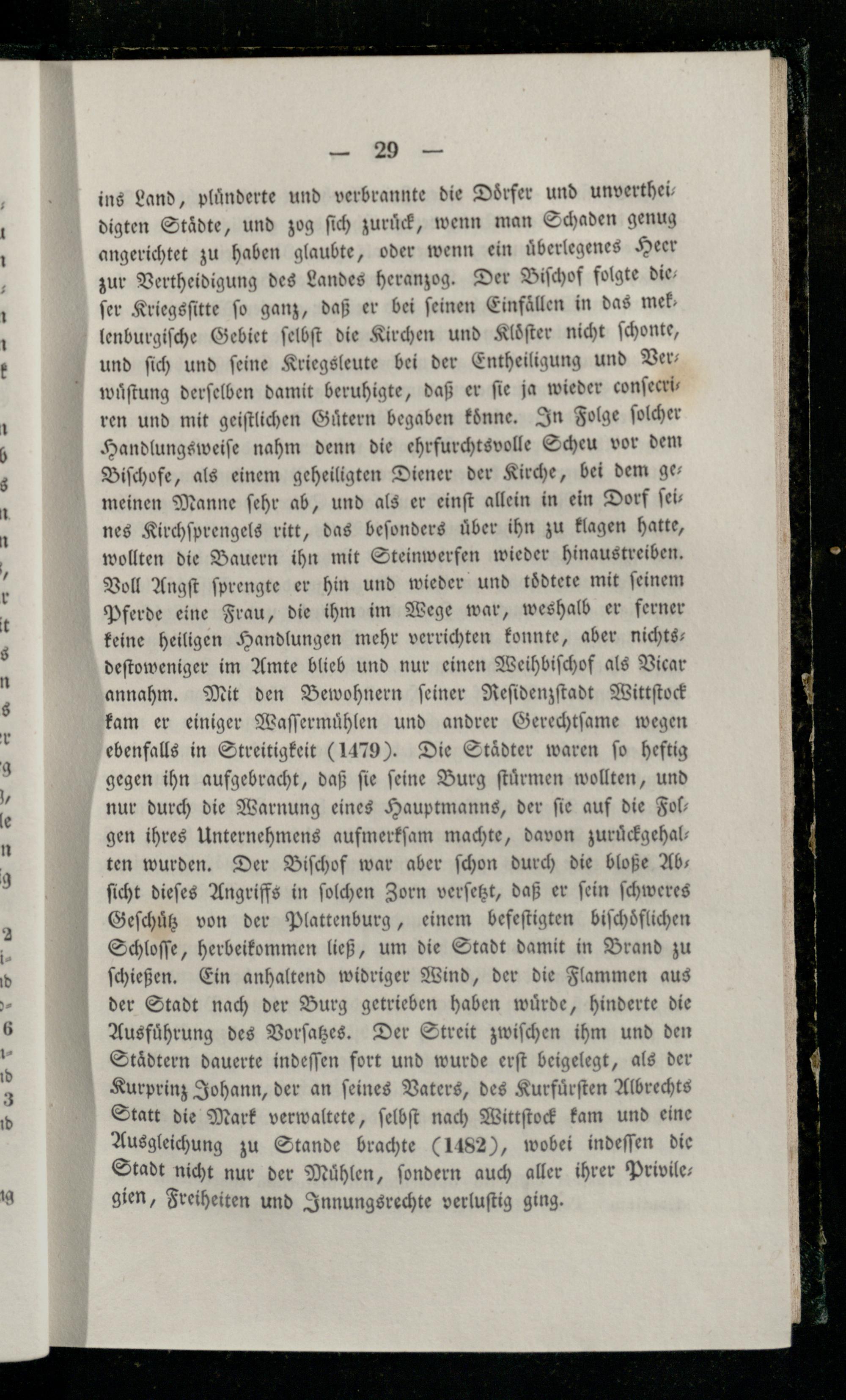 ſer Kriegsſitte ſo ganz, daß er bei ſeinen Einfälle in das lenburgiſche Gebiet ſelbſt die Kirchen und Klöfter nicht ſchonte, und ſich und ſeine Kriegsleute bei der Entheiligung und Verwuͤſtung derſelben damit beruhigte, daß er ſie ja wieder conſecriren und mit geiſtlichen Guͤtern begaben koͤnne. In Folge ſolcher Handlungsweiſe nahm denn die ehrfurchtsvolle Scheu vor dem Biſchofe, als einem geheiligten Diener der Kirche, bei dem ge— meinen Manne ſehr ab, und als er einſt allein in ein Dorf ſeines Kirchſprengels ritt, das beſonders über ihn zu klagen hatte, wollten die Bauern ihn mit Steinwerfen wieder hinaustreiben. Voll Angſt ſprengte er hin und wieder und toͤdtete mit ſeinem Pferde eine Frau, die ihm im Wege war, weshalb er ferner keine heiligen Handlungen mehr verrichten konnte, aber nichts— deſtoweniger im Amte blieb und nur einen W eihbiſchof als Vicar annahm. Mit den Bewohnern ſeiner Reſidenzſtadt Wittſtock kam er einiger Waſſermuͤhlen und andrer Gerechtſame wegen ebenfalls in Streitigkeit(1479). Die Staͤdter waren ſo heftig gegen ihn aufgebracht, daß ſie ſeine Burg ſtuͤrmen wollten, und nur durch die Warnung eines Hauptmanns, der ſie auf die Fol— gen ihres Unternehmens aufmerkſam machte, davon zuruͤckgehal— ten wurden. Der Biſchof war aber ſchon durch die bloße Ab— ſicht dieſes Angriffs in ſolchen Zorn verſetzt, daß er ſein ſchweres Geſchuͤtz von der Plattenburg, einem befeſtigten biſchoͤflichen Schloſſe, herbeikommen ließ, um die Stadt damit in Brand zu ſchießen. Ein anhaltend widriger Wind, der die Flammen aus der Stadt nach der Burg getrieben haben wuͤrde, hinderte die Ausfuͤhrung des Vorſatzes. Der Streit zwiſchen ihm und den Staͤdtern dauerte indeſſen fort und wurde erſt beigelegt, als der Kurprinz Johann, der an ſeines Vaters, des Kurfuͤrſten Albrechts Statt die Mark verwaltete, ſelbſt nach Wittſtock kam und eine Ausgleichung zu Stande brachte(1482), wobei indeſſen die Stadt nicht nur der Mühlen, ſondern auch aller ihrer Privilegien, Freiheiten und Innungsrechte verluſtig ging.