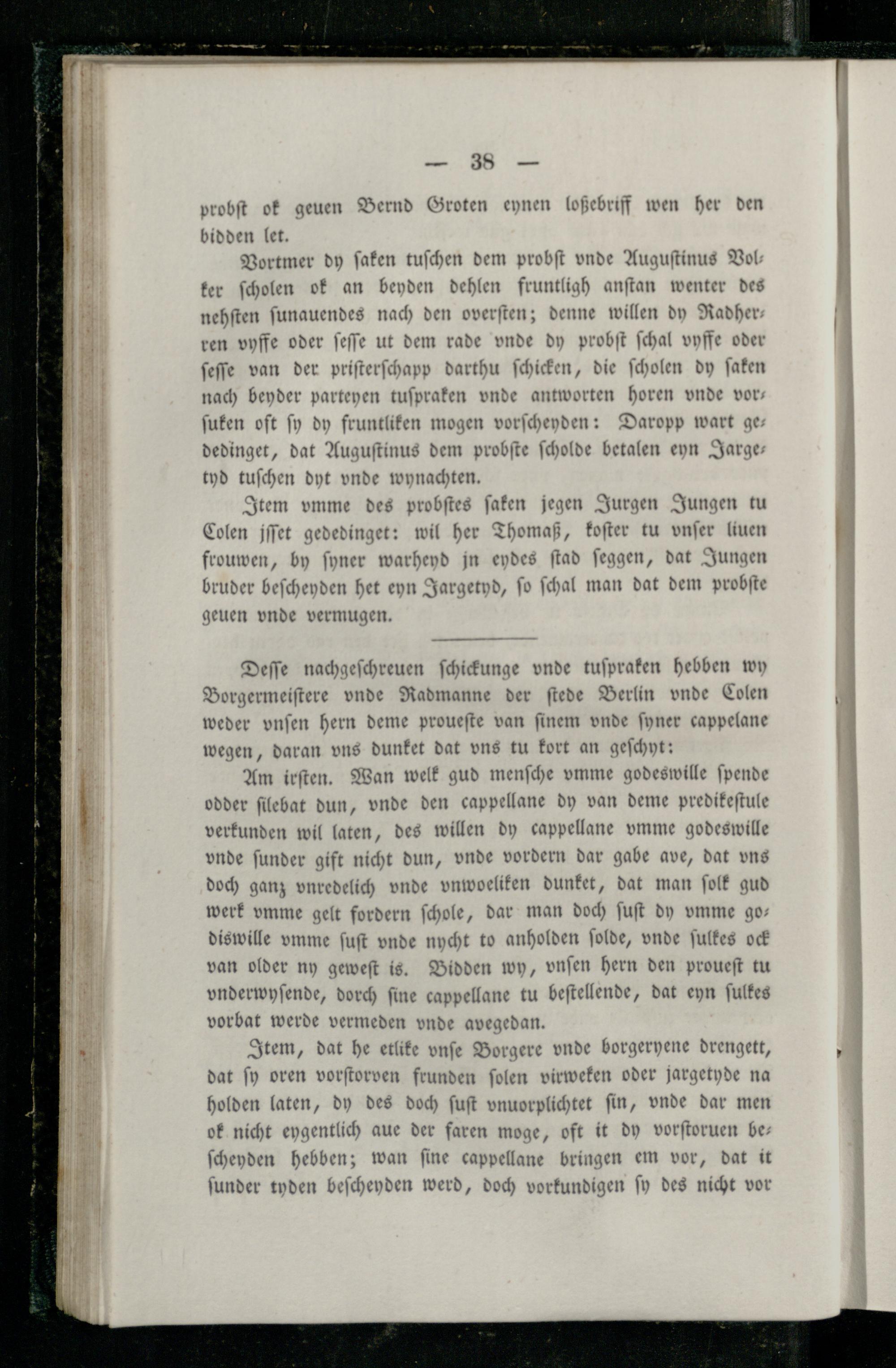 Deſſe nachgeſchreuen ſchickunge vnde tuſpraken hebben wy Borgermeiſtere vnde Radmanne der ſtede Berlin vnde Colen weder vnſen hern deme proueſte van ſinem vnde ſyner cappelane wegen, daran vns dunket dat vns tu kort an geſchyt: