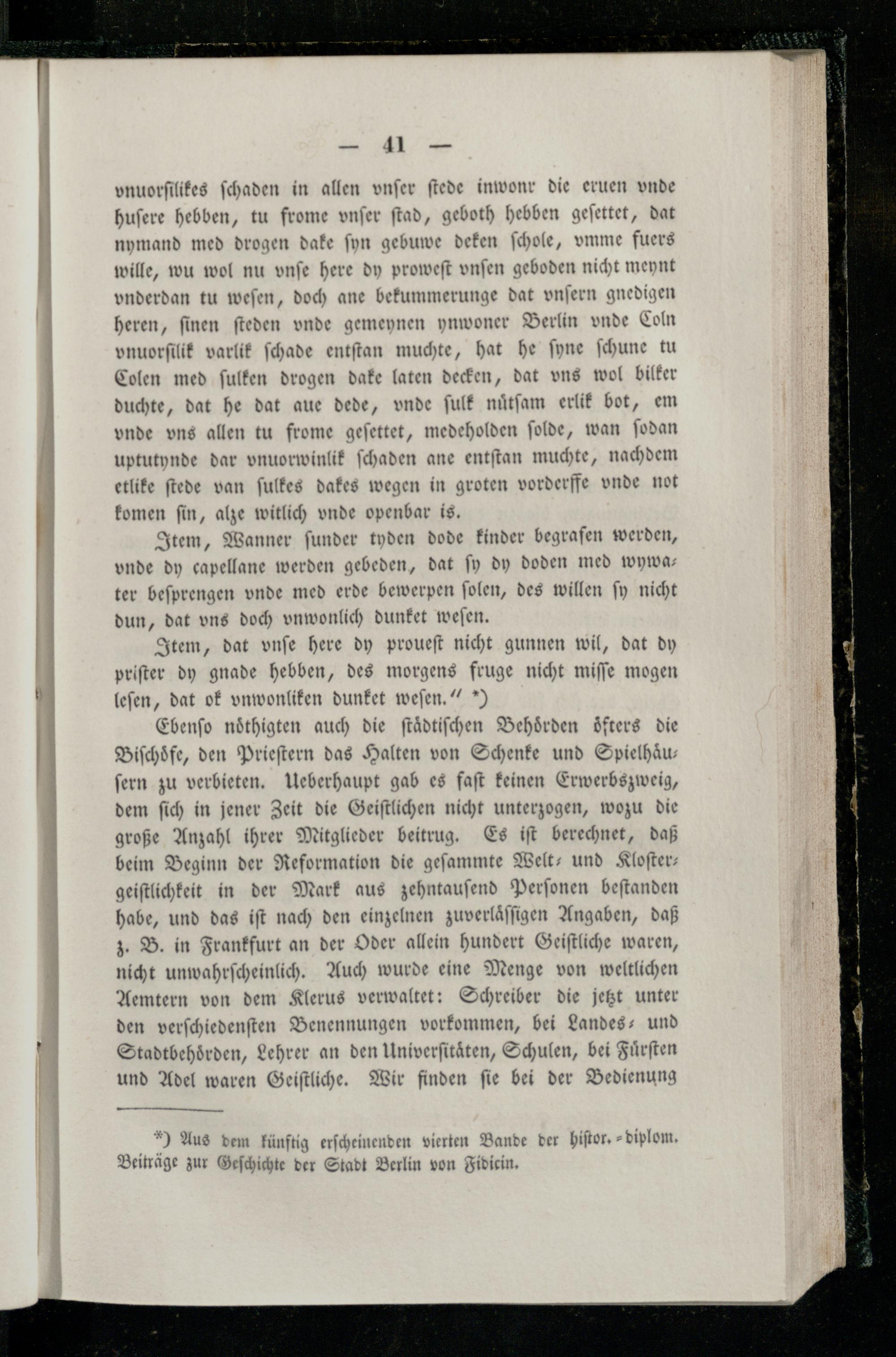 Ebenſo noͤthigten auch die ſtaͤdtiſchen Behörden öfters die Biſchoͤfe, den Prieſtern das Halten von Schenke und Spielhaͤu— ſern zu verbieten. Ueberhaupt gab es faſt keinen Erwerbszweig, dem ſich in jener Zeit die Geiſtlichen nicht unterzogen, wozu die große Anzahl ihrer Mitglieder beitrug. Es iſt berechnet, daß beim Beginn der Reformation die geſammte Welt- und Kloſter— geiſtlichkeit in der Mark aus zehntauſend Perſonen beſtanden habe, und das iſt nach den einzelnen zuverlaͤſſigen Angaben, daß z. B. in Frankfurt an der Oder allein hundert Geiſtliche waren, nicht unwahrſcheinlich. Auch wurde eine Menge von weltlichen Aemtern von dem Klerus verwaltet: Schreiber die jetzt unter den verſchiedenſten Benennungen vorkommen, bei Landes⸗ und Stadtbehoͤrden, Lehrer an den Univerſitaͤten, Schulen, bei Fuͤrſten und Adel waren Geiſtliche. Wir finden ſie bei der Bedienung