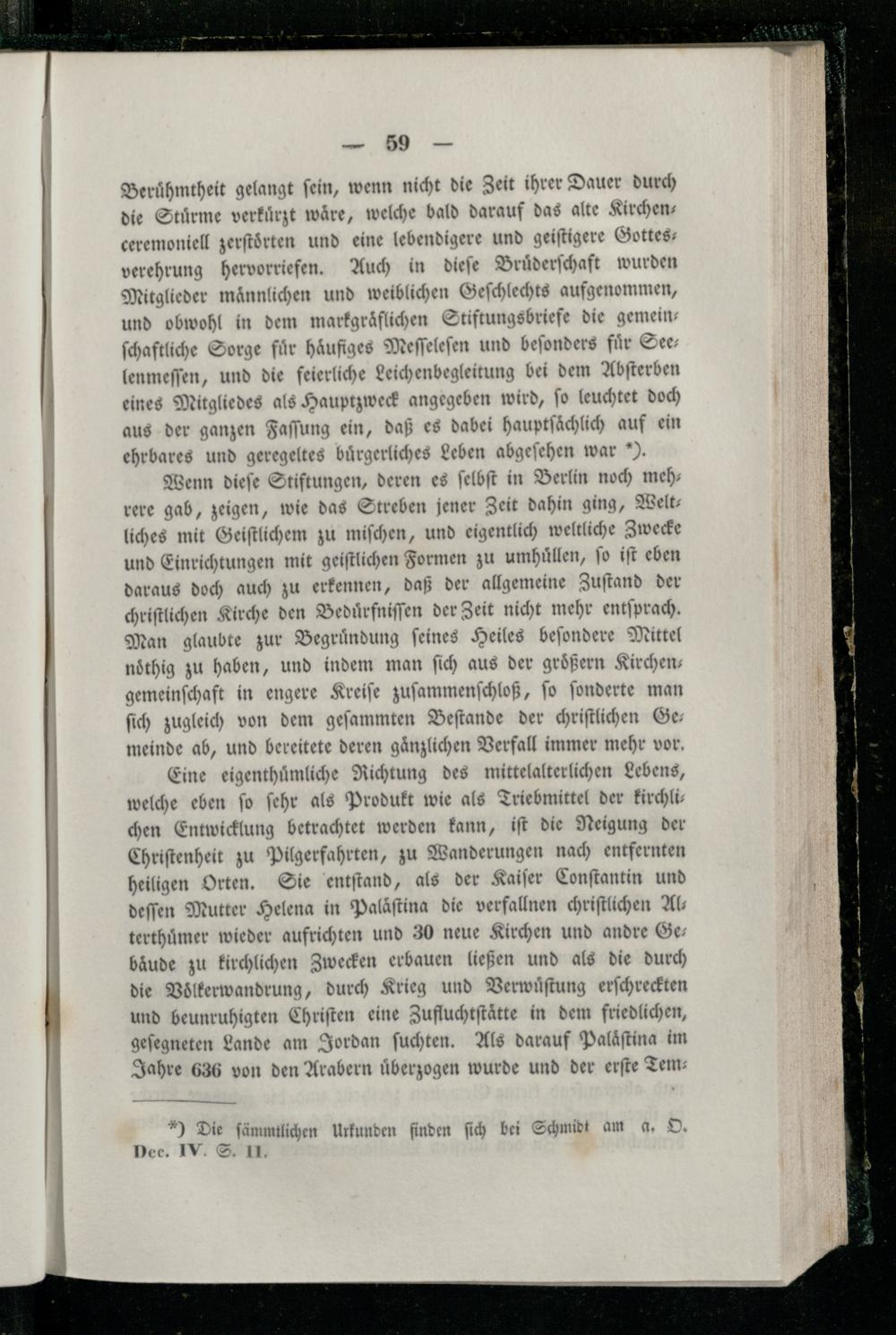 Beruͤhmtheit gelangt ſein, wenn nicht die Zeit ihrer Dauer durch die Stuͤrme verkuͤrzt wäre, welche bald darauf das alte Kirchenceremoniell zerſtoͤrten und eine lebendigere und geiſtigere Gottesverehrung hervorriefen. Auch in dieſe Bruͤderſchaft wurden Mitglieder männlichen und weiblichen Geſchlechts aufgenommen, und obwohl in dem markgraͤflichen Stiftungsbriefe die gemein— ſchaftliche Sorge für häufiges Meſſeleſen und beſonders für See— lenmeſſen, und die feierliche Leichenbegleitung bei dem Abſterben eines Mitgliedes als Hauptzweck angegeben wird, ſo leuchtet doch aus der ganzen Faſſung ein, daß es dabei hauptſaͤchlich auf ein ehrbares und geregeltes buͤrgerliches Leben abgeſehen war) Wenn dieſe Stiftungen, deren es ſelbſt in Berlin noch mehrere gab, zeigen, wie das Streben jener Zeit dahin ging, Welt— liches mit Geiſtlichem zu miſchen, und eigentlich weltliche Zwecke und Einrichtungen mit geiſtlichen Formen zu umhuͤllen, ſo iſt eben daraus doch auch zu erkennen, daß der allgemeine Zuſtand der chriſtlichen Kirche den Beduͤrfniſſen der Zeit nicht mehr entſprach. Man glaubte zur Begruͤndung ſeines Heiles beſondere Mittel noͤthig zu haben, und indem man ſich aus der groͤßern Kirchen— gemeinſchaft in engere Kreiſe zuſammenſchloß, ſo ſonderte man ſich zugleich von dem geſammten Beſtande der chriſtlichen Ge— meinde ab, und bereitete deren gänzlichen Verfall immer mehr vor. Eine eigenthuͤmliche Richtung des mittelalterlichen Lebens, welche eben fo ſehr als Produkt wie als Triebmittel der kirchli— chen Entwicklung betrachtet werden kann, iſt die Neigung der Chriſtenheit zu Pilgerfahrten, zu Wanderungen nach entfernten heiligen Orten. Sie entſtand, als der Kaiſer Conſtantin und deſſen Mutter Helena in Paläſtina die verfallnen chriſtlichen Alterthuͤmer wieder aufrichten und 30 neue Kirchen und andre Ge— baͤude zu kirchlichen Zwecken erbauen ließen und als die durch die Voͤlkerwandrung, durch Krieg und Verwuͤſtung erſchreckten und beunruhigten Chriſten eine Zufluchtſtaͤtte in dem friedlichen, geſegneten Lande am Jordan ſuchten. Als darauf Palaͤſtina im Jahre 636 von den Arabern uͤberzogen wurde und der erſte Tem— 2. Die ſämmtlichen Urkunden finden ſich bei Schmidt am a. O