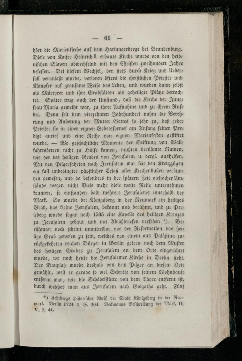 hoͤrt die Marienkirche auf dem Harlungerberge bei Brandenburg. Dieſe von Kaiſer Heinrich J. erbaute Kirche wurde von den Heid: niſchen Slaven abwechſelnd mit den Chriſten zweihundert Jahre beſeſſen. Bei dieſem Wechſel, der ſtets durch Krieg und Ueber— fall veranlaßt wurde, verloren oͤfters die chriſtlichen Prieſter und Kämpfer auf grauſame Weiſe das Leben, und wurden dann ſelbſt als Märtyrer und ihre Grabſtätten als geheiligte Plaͤtze betrach tet. Spaͤter trug auch der Umſtand, daß die Kirche der Jung— frau Maria geweiht war, zu ihrer Aufnahme und zu ihrem Rufe bei. Denn ſeit dem vierzehnten Jahrhundert nahm die Vereh— rung und Anbetung der Mutter Gottes ſo ſehr zu, daß jeder Prieſter ſie in einer eignen Gebetsformel am Anfang ſeiner Pre— digt anrief und eine Reihe von eignen Marienfeſten geſtiftet wurde.— Wo geſchichtliche Momente der Stiftung von Wall— fahrtsortern nicht zu Huͤlfe kamen, mußten berühmte Namen, wie der des heiligen Grabes von Jeruſalem u. dergl. aushelfen. Mit den Pilgerfahrten nach Jeruſalem war ſeit den Kreuzzuͤgen ein faſt unbedingter paͤpſtlicher Erlaß aller Kirchenbußen verbun— den geweſen, und da we e. in der ſpaͤtern Zeit vielfacher Um— ſtaͤnde wegen nicht Viele mehr dieſe weite Reife unternehmen konnten, ſo entſtanden bald mehrere Jeruſalems innerhalb der Mark. So wurde bei Koͤnigsberg in der Neumark ein heiliges Grab, das kleine Jeruſalem, bekannt und beruͤhmt, und zu Per— leberg wurde ſogar noch 1505 eine Kapelle des heiligen Kreuzes zu Jeruſalem gebaut und mit Ablaßbriefen verſehen). Des ruͤhmter noch ſcheint unmittelbar vor der Reformation das hei— lige Grab geweſen zu ſein, welches von einem aus Palaͤſtina zu— ruͤckgekehrten reichen Buͤrger in Berlin getreu nach dem Muſter des heiligen Grabes zu Jeruſalem an dem Orte eingerichtet wurde, wo noch heute die Jeruſalemer Kirche in Berlin ſteht. Der Bauplatz wurde deshalb von dem Pilger an dieſem Orte gewaͤhlt, weil er gerade ſo viel Schritte von ſeinem Wohnhauſe entfernt war, wie die Schaͤdelſtaͤtte von dem Thore entfernt iſt, durch welches man aus Jeruſalem nach Golgatha geht. Fünf