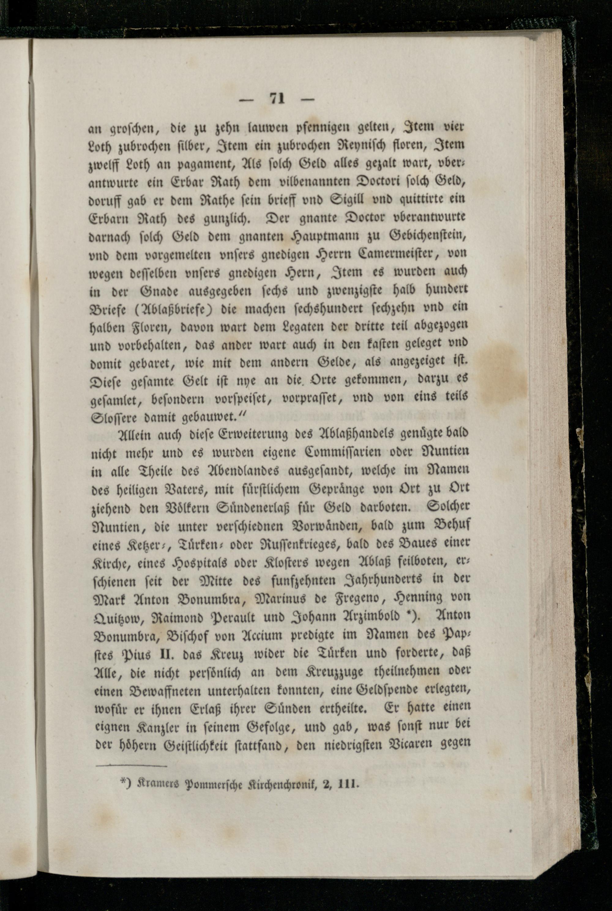Allein auch dieſe Erweiterung des Ablaßhandels genuͤgte bald nicht mehr und es wurden eigene Commiſſarien oder Nuntien in alle Theile des Abendlandes ausgeſandt, welche im Namen des heiligen Vaters, mit fuͤrſtlichem Gepraͤnge von Ort zu Ort ziehend den Völkern Suͤndenerlaß für Geld darboten. Solcher Nuntien, die unter verſchiednen Vorwaͤnden, bald zum Behuf eines Ketzer-, Tuͤrken- oder Ruſſenkrieges, bald des Baues einer Kirche, eines Hospitals oder Kloſters wegen Ablaß feilboten, ers ſchienen ſeit der Mitte des funfzehnten Jahrhunderts in der Mark Anton Bonumbra, Marinus de Fregeno, Henning von Quitzow, Raimond Perault und Johann Arzimbold Y. Anton Bonumbra, Biſchof von Accium predigte im Namen des Pap—ſtes Pius II. das Kreuz wider die Tuͤrken und forderte, daß Alle, die nicht perſoͤnlich an dem Kreuzzuge theilnehmen oder einen Bewaffneten unterhalten konnten, eine Geldſpende erlegten, wofuͤr er ihnen Erlaß ihrer Suͤnden ertheilte. Er hatte einen eignen Kanzler in ſeinem Gefolge, und gab, was ſonſt nur bei der hoͤhern Geiſtlichkeit ſtattſand, den niedrigſten Vicaren gegen