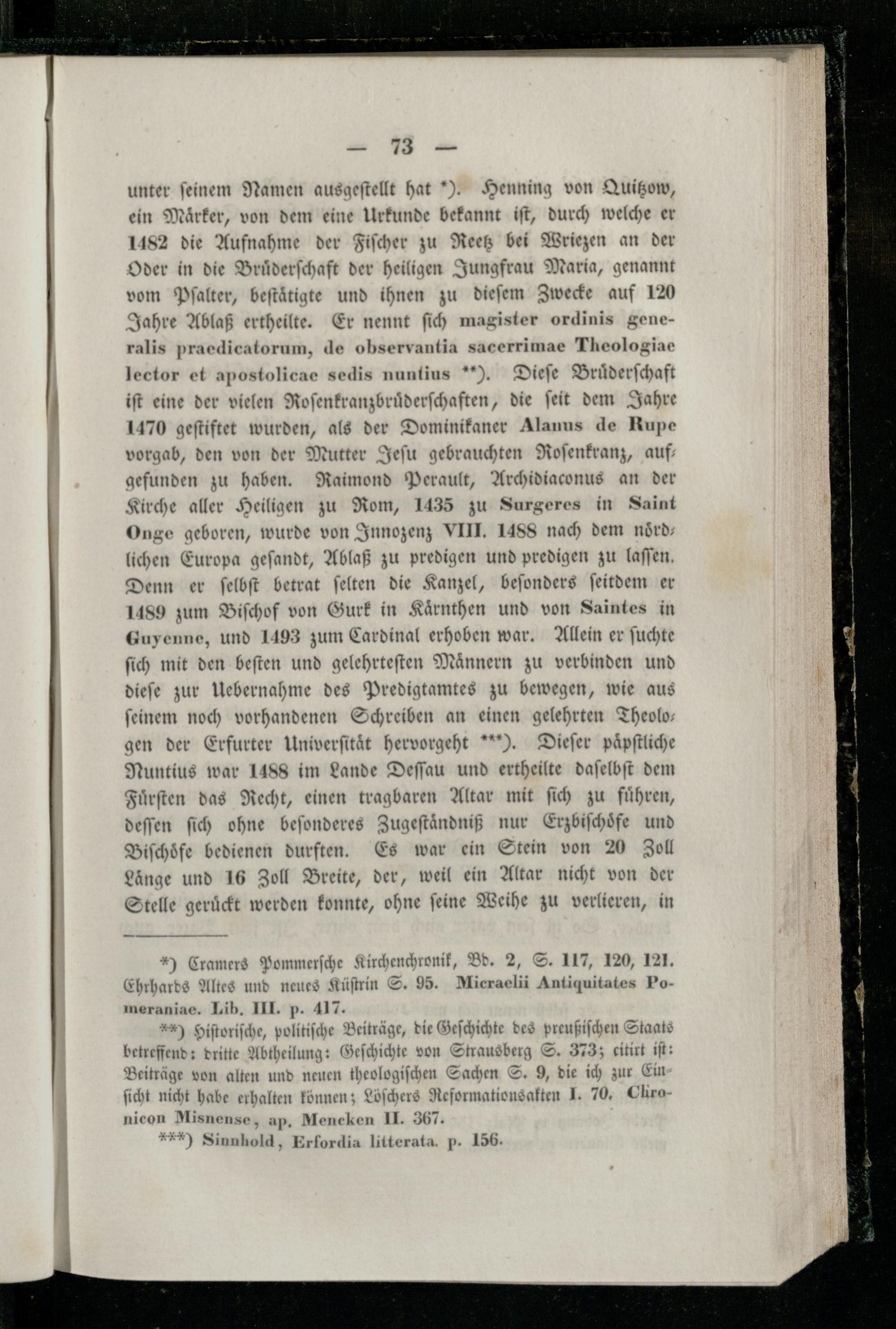 unter feinem Namen ausgeſtellt hat). Henning von Quitzow, ein Maͤrker, von dem eine Urkunde bekannt iſt, durch welche er 1482 die Aufnahme der Fiſcher zu Reetz bei Wriezen an der Oder in die Bruͤderſchaft der heiligen Jungfrau Maria, genannt vom Pſalter, beſtaͤtigte und ihnen zu dieſem Zwecke auf 120 Jahre Ablaß ertheilte. Er nennt ſich magister ordinis gene— ralis praedicatorum, de observantia sacerrimae Theologiae lector et apostolicae sedis nuntius*). Dieſe Bruͤderſchaft iſt eine der vielen Roſenkranzbruͤderſchaften, die ſeit dem Jahre 1470 geſtiftet wurden, als der Dominikaner Alanus de Rupe vorgab, den von der Mutter Jeſu gebrauchten Roſenkranz, auf— gefunden zu haben. Raimond Perault, Archidiaconus an der Kirche aller Heiligen zu Rom, 1435 zu Surgeres in Saint Onge geboren, wurde von Innozenz VIII. 1488 nach dem noͤrd— lichen Europa geſandt, Ablaß zu predigen und predigen zu laſſen. Denn er ſelbſt betrat ſelten die Kanzel, beſonders ſeitdem er 1489 zum Biſchof von Gurk in Kaͤrnthen und von Saintes in Guyenne, und 1493 zum Cardinal erhoben war. Allein er ſuchte ſich mit den beſten und gelehrteſten Männern zu verbinden und dieſe zur Uebernahme des Predigtamtes zu bewegen, wie aus ſeinem noch vorhandenen Schreiben an einen gelehrten Theolo— gen der Erfurter Univerſitaͤt hervorgeht*). Dieſer paͤpſtliche Nuntius war 1488 im Lande Deſſau und ertheilte daſelbſt dem Fuͤrſten das Recht, einen tragbaren Altar mit ſich zu fuͤhren, deſſen ſich ohne beſonderes Zugeſtaͤndniß nur Erzbiſchoͤfe und Biſchoͤfe bedienen durften. Es war ein Stein von 20 Zoll Lange und 16 Zoll Breite, der, weil ein Altar nicht von der Stelle geruͤckt werden konnte, ohne ſeine Weihe zu verlieren, in