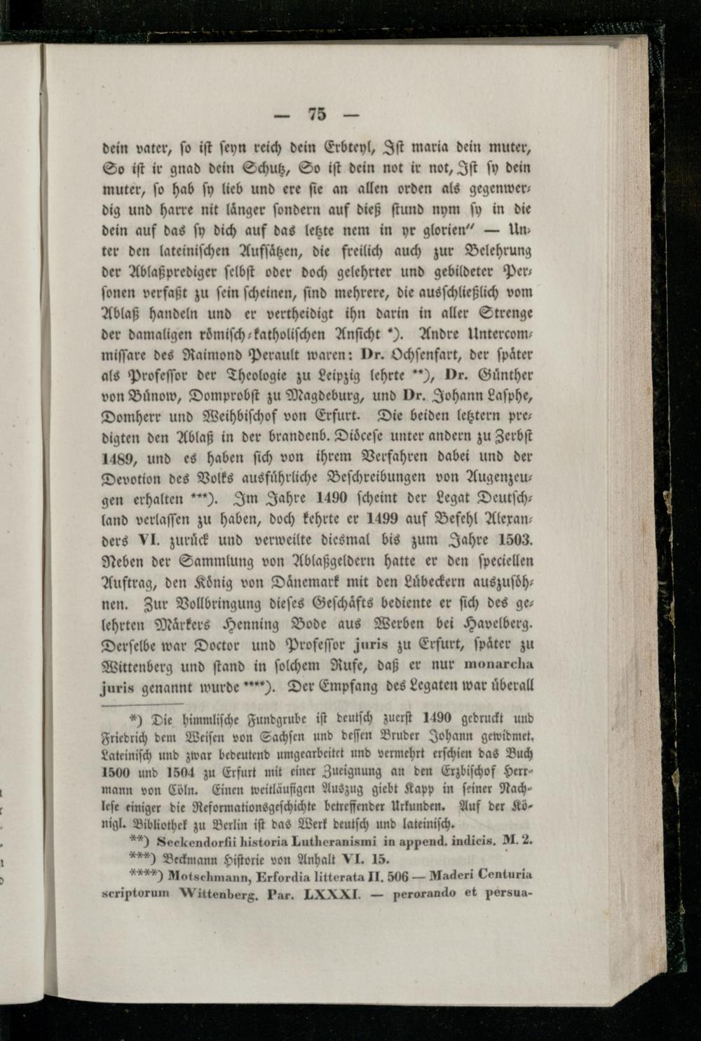 dein vater, ſo iſt ſeyn reich dein Erbteyl, Iſt maria dein muter, So iſt ir gnad dein Schutz, So iſt dein not ir not, Iſt ſy dein muter, fo hab ſy lieb und ere fie an allen orden als gegenwerdig und harre nit länger ſondern auf dieß ſtund nym ſy in die dein auf das ſy dich auf das letzte nem in yr glorien“— Un— ter den lateiniſchen Aufſaͤtzen, die freilich auch zur Belehrung der Ablaßprediger ſelbſt oder doch gelehrter und gebildeter Per— ſonen verfaßt zu ſein ſcheinen, ſind mehrere, die ausſchließlich vom Ablaß handeln und er vertheidigt ihn darin in aller Strenge der damaligen roöͤmiſch-katholiſchen Anſicht). Andre Untercom— miſſare des Raimond Perault waren: Dr. Ochſenfart, der ſpaͤter als Profeſſor der Theologie zu Leipzig lehrte„), Dr. Guͤnther von Buͤnow, Domprobſt zu Magdeburg, und Dr. Johann Laſphe, Domherr und Weihbiſchof von Erfurt. Die beiden letztern pres digten den Ablaß in der brandenb. Didceſe unter andern zu Zerbſt 1489, und es haben ſich von ihrem Verfahren dabei und der Devotion des Volks ausfuͤhrliche Beſchreibungen von Augenzeu— gen erhalten). Im Jahre 1490 ſcheint der Legat Deutſchland verlaſſen zu haben, doch kehrte er 1499 auf Befehl Alexan— ders VI. zuruͤck und verweilte diesmal bis zum Jahre 1503. Neben der Sammlung von Ablaßgeldern hatte er den ſpeciellen Auftrag, den König von Dänemark mit den Luͤbeckern auszuſoͤh— nen. Zur Vollbringung dieſes Geſchaͤfts bediente er ſich des ge— lehrten Märkers Henning Bode aus Werben bei Havelberg. Derſelbe war Doctor und Profeſſor juris zu Erfurt, ſpaͤter zu Wittenberg und ſtand in ſolchem Rufe, daß er nur monarcha juris genannt wurde). Der Empfang des Legaten war überall
