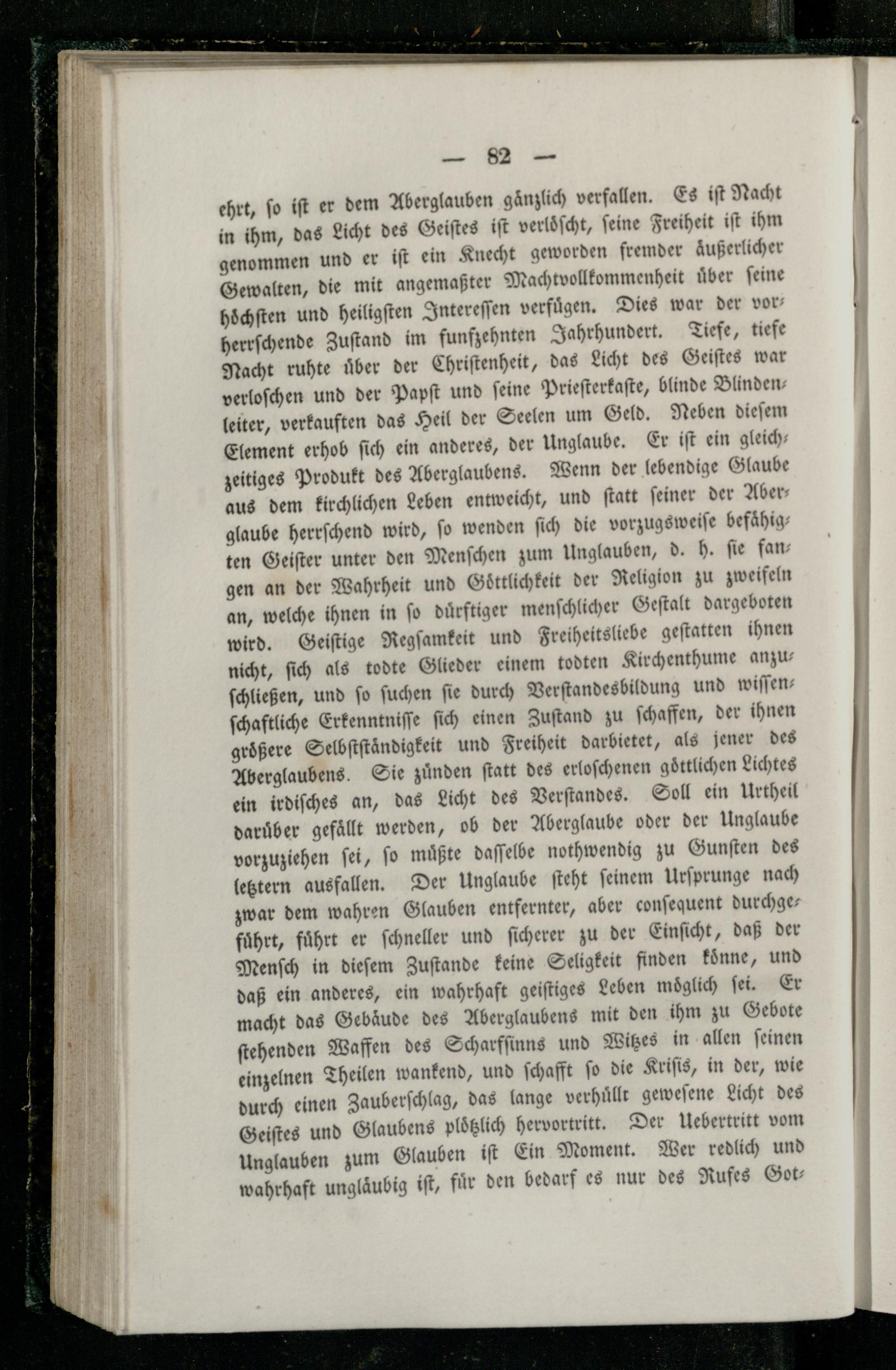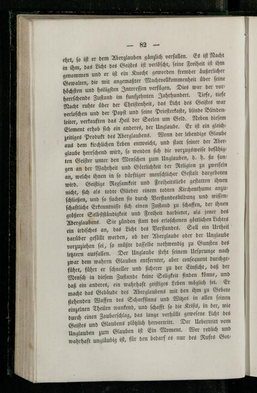 ehrt, fo iſt er dem Aberglauben ganzlich verfallen. Es iſt Nacht in ihm, das Licht des Geiſtes iſt verloͤſcht, feine Freiheit iſt ihm genommen und er iſt ein Knecht geworden fremder außerlicher Gewalten, die mit angemaßter Machtvollkommenheit uͤber ſeine hoͤchſten und heiligſten Intereſſen verfügen, Dies war der vor herrſchende Zuſtand im funfzehnten Jahrhundert. Tiefe, tiefe Nacht ruhte uͤber der Chriſtenheit, das Licht des Geiſtes war verloſchen und der Papſt und ſeine Prieſterkaſte, blinde Blindenleiter, verkauften das Heil der Seelen um Geld. Neben dieſem Element erhob ſich ein anderes, der Unglaube. Er iſt ein gleich— zeitiges Produkt des Aberglaubens. Wenn der lebendige Glaube aus dem kirchlichen Leben entweicht, und ſtatt ſeiner der Aberglaube herrſchend wird, ſo wenden ſich die vorzugsweiſe befaͤhig ten Geiſter unter den Menſchen zum Unglauben, d. h. ſie fan gen an der Wahrheit und Goͤttlichkeit der Religion zu zweifeln an, welche ihnen in ſo duͤrftiger menſchlicher Geſtalt dargeboten wird. Geiſtige Regſamkeit und Freiheitsliebe geſtatten ihnen nicht, ſich als todte Glieder einem todten Kirchenthume anzu— ſchließen, und ſo ſuchen ſie durch Verſtandesbildung und wiſſenſchaftliche Erkenntniſſe ſich einen Zuſtand zu ſchaffen, der ihnen größere Selbſtſtaͤndigkeit und Freiheit darbietet, als jener des Aberglaubens. Sie zuͤnden ſtatt des erloſchenen göttlichen Lichtes ein irdiſches an, das Licht des Verſtandes. Soll ein Urtheil daruͤber gefällt werden, ob der Aberglaube oder der Unglaube vorzuziehen ſei, ſo muͤßte daſſelbe nothwendig zu Gunſten des letztern ausfallen. Der Unglaube ſteht ſeinem Urſprunge nach zwar dem wahren Glauben entfernter, aber conſequent durchgefuͤhrt, fuͤhrt er ſchneller und ſicherer zu der Einſicht, daß der Menſch in dieſem Zuſtande keine Seligkeit finden koͤnne, und daß ein anderes, ein wahrhaft geiſtiges Leben moͤglich ſei. Er macht das Gebaͤude des Aberglaubens mit den ihm zu Gebote ſtehenden Waffen des Scharfſinns und Witzes in allen ſeinen einzelnen Theilen wankend, und ſchafft ſo die Kriſis, in der, wie durch einen Zauberſchlag, das lange verhuͤllt geweſene Licht des Geiſtes und Glaubens ploͤtzlich hervortritt. Der Uebertritt vom Unglauben zum Glauben iſt Ein Moment. Wer redlich und wahrhaft unglaͤubig iſt, fuͤr den bedarf es nur des Rufes Got