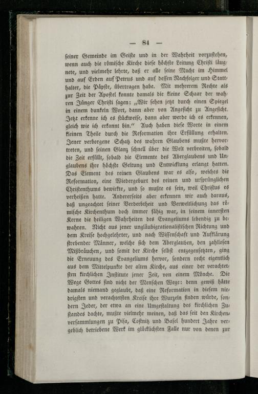 feiner Gemeinde im Geiſte und in der Wahrheit vorzuſtehen, wenn auch die roͤmiſche Kirche dieſe hoͤchſte Leitung Chriſti(Aug nete, und vielmehr lehrte, daß er alle ſeine Macht im Himmel und auf Erden auf Petrus und auf deſſen Nachfolger und Statthalter, die Paͤpſte, uͤbertragen habe. Mit mehrerem Rechte als zur Zeit der Apoſtel konnte damals die kleine Schaar der wah ren Juͤnger Chriſti ſagen:„Wir ſehen jetzt durch einen Spiegel in einem dunkeln Wort, dann aber von Angeſicht zu Angeſicht. Jetzt erkenne ich es ſtuͤckweiſe, dann aber werde ich es erkennen, gleich wie ich erkannt bin.“ Auch haben dieſe Worte in einem kleinen Theile durch die Reformation ihre Erfuͤllung erhalten. Jener verborgene Schatz des wahren Glaubens mußte hervortreten, und ſeinen Glanz ſchnell uͤber die Welt verbreiten, ſobald die Zeit erfuͤllt, ſobald die Elemente des Aberglaubens und Unglaubens ihre hoͤchſte Geltung und Entwicklung erlangt hatten. Das Element des reinen Glaubens war es alſo, welches die Reformation, eine Wiedergeburt des reinen und urſpruͤnglichen Chriſtenthums bewirkte, und ſo mußte es ſein, weil Chriſtus es verheißen hatte. Andererſeits aber erkennen wir auch daraus, daß ungeachtet ſeiner Verderbtheit und Verweltlichung das roͤmiſche Kirchenthum doch immer faͤhig war, in ſeinem innerſten Kerne die heiligen Wahrheiten des Evangeliums lebendig zu be— wahren. Nicht aus jener unglaͤubigrationaliſtiſchen Richtung und dem Kreiſe hochgelehrter, und nach Wiſſenſchaft und Aufklaͤrung ſtrebender Männer, welche ſich dem Aberglauben, den zahlloſen Mißbraͤuchen, und ſomit der Kirche ſelbſt entgegenſetzten, ging die Erneuung des Evangeliums hervor, ſondern recht eigentlich aus dem Mittelpunkte der alten Kirche, aus einer der verachtet— ſten kirchlichen Inſtitute jener Zeit, von einem Moͤnche. Die Wege Gottes find nicht der Menſchen Wege: denn gewiß Hätte damals niemand geglaubt, daß eine Reformation in dieſem nie— drigſten und verachtetſten Kreiſe ihre Wurzeln finden würde, fon: dern Jeder, der etwa an eine Umgeſtaltung des kirchlichen Zu— ſtandes dachte, mußte vielmehr meinen, daß das ſeit den Kirchen— verſammlungen zu Piſa, Coſtnitz und Baſel hundert Jahre ver geblich betriebene Werk im gluͤcklichſten Falle nur von denen zur