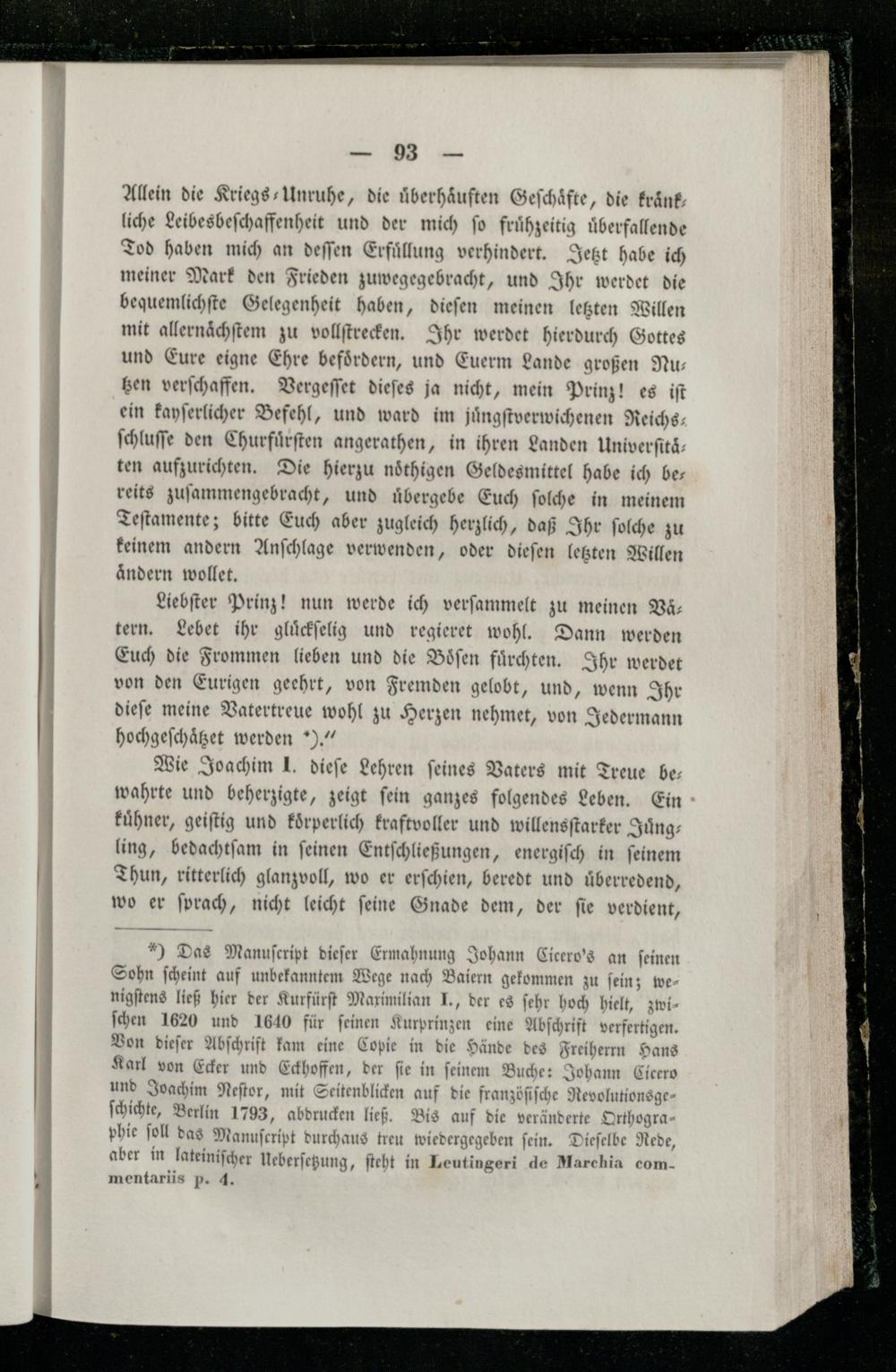 Wie Joachim I. dieſe Lehren feines Vaters mit Treue be- wahrte und beherzigte, zeigt ſein ganzes folgendes Leben. Ein kuͤhner, geiſtig und koͤrperlich kraftvoller und willensſtarker Juͤngling, bedachtſam in ſeinen Entſchließungen, energiſch in ſeinem Thun, ritterlich glanzvoll, wo er erſchien, beredt und uͤberredend, wo er ſprach, nicht leicht ſeine Gnade dem, der ſie verdient, *) Das Manuſcript dieſer Ermahnung Johann Cicero's an ſeinen Sohn ſcheint auf unbekanntem Wege nach Baiern gekommen zu ſein; wenigſtens ließ hier der Kurfürſt Maximilian J., der es ſehr hoch hielt, zwiſchen 1620 und 1640 für ſeinen Kurprinzen eine Abſchrift verfertigen. Von dieſer Abſchrift kam eine Copie in die Hände des Freiherrn Hans Karl von Ecker und Eckhoffen, der fie in feinem Buche: Johann Cicero und Joachim Neſtor, mit Seitenblicken auf die franzöſiſche Revolutionsgeſchichte, Berlin 1793, abdrucken ließ. Bis auf die veränderte Orthogra phie ſoll das Manuſcript durchaus treu wiedergegeben ſein. Dieſelbe Rede, aber in lateiniſcher Ueberſetzung, ſteht in Leutingeri de Marchia commentariis p. 4.