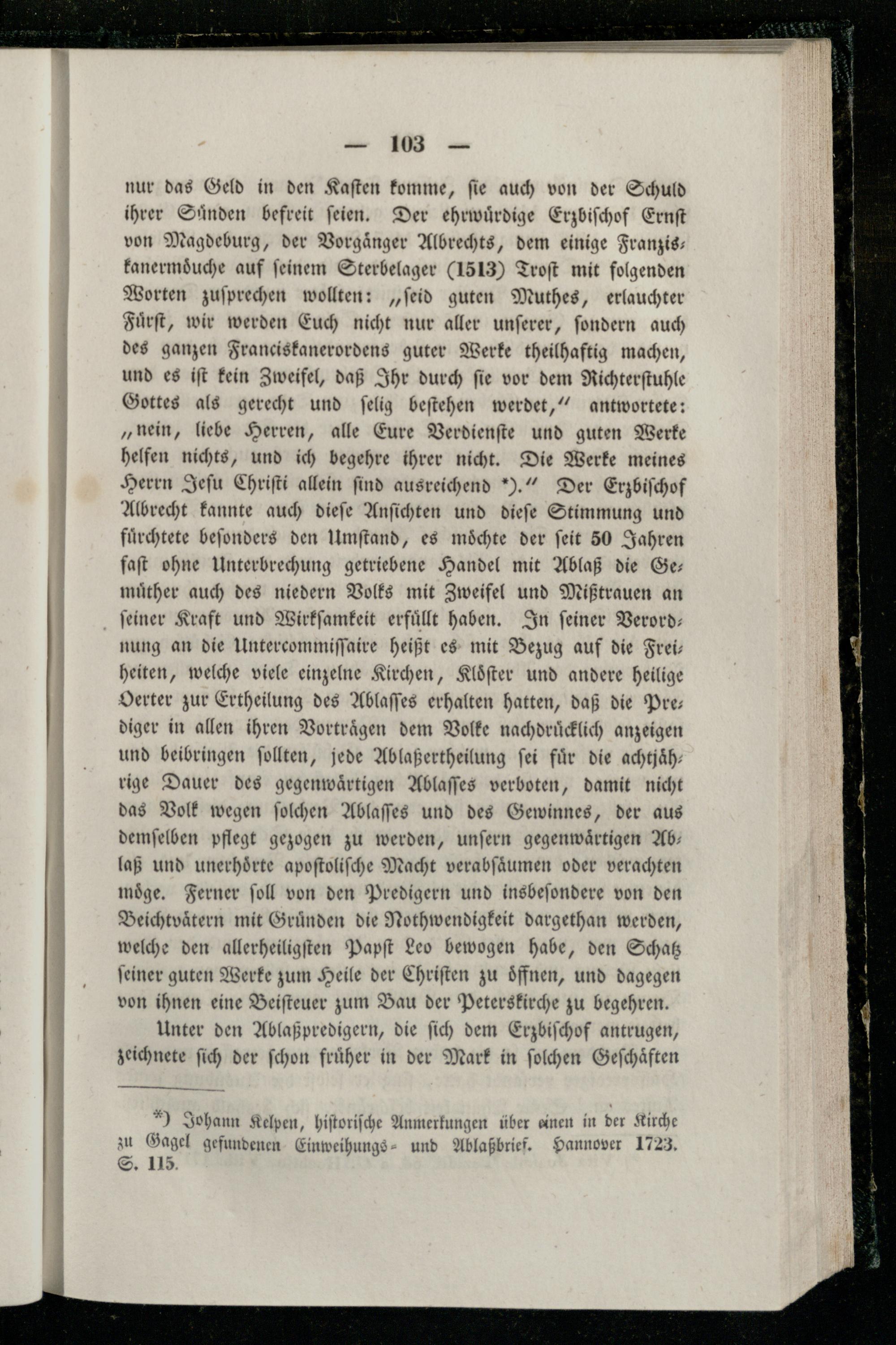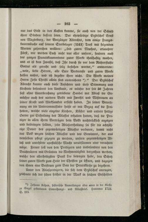 nur das Geld in den Kaſten komme, ſie auch von der Schuld ihrer Sünden befreit ſeien. Der ehrwuͤrdige Erzbiſchof Ernſt von Magdeburg, der Vorgaͤnger Albrechts, dem einige Franzis- kanermoͤnche auf feinem Sterbelager(1513) Troſt mit folgenden Worten zuſprechen wollten:„ſeid guten Muthes, erlauchter Fuͤrſt, wir werden Euch nicht nur aller unſerer, ſondern auch des ganzen Franciskanerordens guter Werke theilhaftig machen, und es iſt kein Zweifel, daß Ihr durch ſie vor dem Richterſtuhle Gottes als gerecht und ſelig beſtehen werdet,“ antwortete: „nein, liebe Herren, alle Eure Verdienſte und guten Werke helfen nichts, und ich begehre ihrer nicht. Die Werke meines Herrn Jeſu Chriſti allein find ausreichend).“ Der Erzbiſchof Albrecht kannte auch dieſe Anſichten und dieſe Stimmung und fuͤrchtete beſonders den Umſtand, es möchte der ſeit 50 Jahren faſt ohne Unterbrechung getriebene Handel mit Ablaß die Se: muͤther auch des niedern Volks mit Zweifel und Mißtrauen an ſeiner Kraft und Wirkſamkeit erfuͤllt haben. In ſeiner Verord— nung an die Untercommiſſaire heißt es mit Bezug auf die Frei; heiten, welche viele einzelne Kirchen, Kloͤſter und andere heilige Oerter zur Ertheilung des Ablaſſes erhalten hatten, daß die Pre— diger in allen ihren Vorträgen dem Volke nachdrücklich anzeigen und beibringen ſollten, jede Ablaßertheilung ſei für die achtjäh: rige Dauer des gegenwartigen Ablaſſes verboten, damit nicht das Volk wegen ſolchen Ablaſſes und des Gewinnes, der aus demſelben pflegt gezogen zu werden, unſern gegenwaͤrtigen Ab— laß und unerhoͤrte apoſtoliſche Macht verabſaͤumen oder verachten möge. Ferner ſoll von den Predigern und insbeſondere von den Beichtvätern mit Gruͤnden die Nothwendigkeit dargethan werden, welche den allerheiligſten Papſt Leo bewogen habe, den Schatz feiner guten Werke zum Heile der Chriſten zu oͤffnen, und dagegen von ihnen eine Beiſteuer zum Bau der Peterskirche zu begehren.