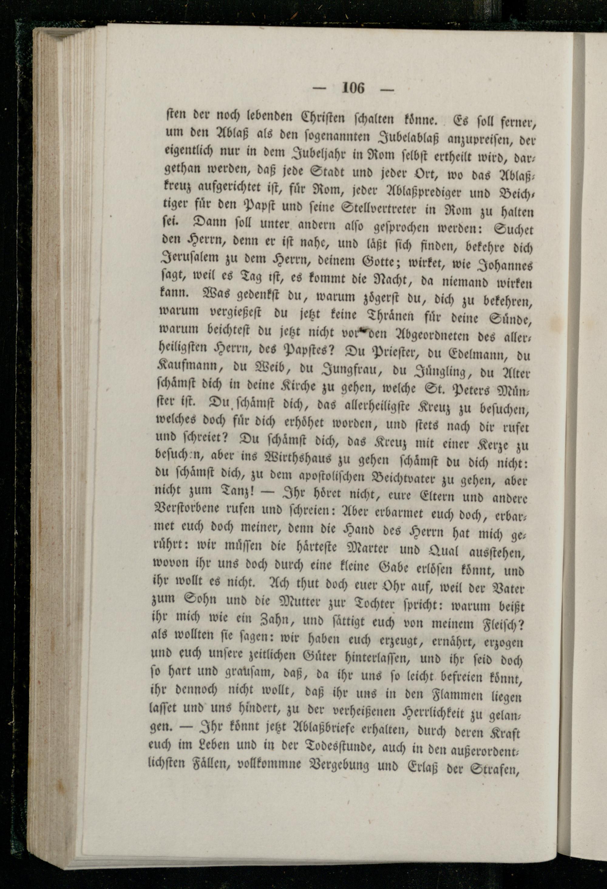 ſten der noch lebenden Chriſten ſchalten koͤnne. Es ſoll ferner, um den Ablaß als den ſogenannten Jubelablaß anzupreiſen, der eigentlich nur in dem Jubeljahr in Rom ſelbſt ertheilt wird, dargethan werden, daß jede Stadt und jeder Ort, wo das Ablaß— kreuz aufgerichtet iſt, für Rom, jeder Ablaßprediger und Beichtiger fuͤr den Papſt und ſeine Stellvertreter in Rom zu halten ſei. Dann ſoll unter andern alſo geſprochen werden: Suchet den Herrn, denn er iſt nahe, und laͤßt ſich finden, bekehre dich Jeruſalem zu dem Herrn, deinem Gotte; wirket, wie Johannes ſagt, weil es Tag iſt, es kommt die Nacht, da niemand wirken kann. Was gedenkſt du, warum zoͤgerſt du, dich zu bekehren, warum vergießeſt du jetzt keine Thraͤnen für deine Sünde, warum beichteſt du jetzt nicht vor=den Abgeordneten des aller— heiligſten Herrn, des Papſtes? Du Prieſter, du Edelmann, du Kaufmann, du Weib, du Jungfrau, du Juͤngling, du Alter ſchaͤmſt dich in deine Kirche zu gehen, welche St. Peters Muͤn— ſter iſt. Du ſchaͤmſt dich, das allerheiligſte Kreuz zu beſuchen, welches doch fuͤr dich erhoͤhet worden, und ſtets nach dir rufet und ſchreiet? Du ſchaͤmſt dich, das Kreuz mit einer Kerze zu beſuchen, aber ins Wirthshaus zu gehen ſchaͤmſt du dich nicht: du ſchamſt dich, zu dem apoſtoliſchen Beichtvater zu gehen, aber nicht zum Tanz!— Ihr hoͤret nicht, eure Eltern und andere Verſtorbene rufen und ſchreien: Aber erbarmet euch doch, erbarmet euch doch meiner, denn die Hand des Herrn hat mich ge— ruͤhrt: wir muͤſſen die haͤrteſte Marter und Qual ausſtehen, wovon ihr uns doch durch eine kleine Gabe erloͤſen koͤnnt, und ihr wollt es nicht. Ach thut doch euer Ohr auf, weil der Vater zum Sohn und die Mutter zur Tochter ſpricht: warum beißt ihr mich wie ein Zahn, und ſaͤttigt euch von meinem Fleiſch? als wollten ſie ſagen: wir haben euch erzeugt, ernährt, erzogen und euch unſere zeitlichen Guͤter hinterlaſſen, und ihr ſeid doch ſo hart und grauſam, daß, da ihr uns ſo leicht befreien koͤnnt, ihr dennoch nicht wollt, daß ihr uns in den Flammen liegen laſſet und uns hindert, zu der verheißenen Herrlichkeit zu gelangen.— Ihr koͤnnt jetzt Ablaßbriefe erhalten, durch deren Kraft euch im Leben und in der Todesſtunde, auch in den außerordentlichſten Fällen, vollkommne Vergebung und Erlaß der Strafen,