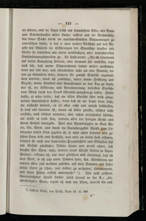 tet Hätten; und da Tetzel ſelbſt mit fanatiſchem Eifer, mit Bann und Scheiterhaufen wider Luther auftrat und die Rechtmaͤßigkeit ſeiner Sache durch die ausſchweifendſten Behauptungen zu unterſtuͤtzen ſuchte, ſo ließ er ohne weitere Ruͤckſicht auf das Be— gehr des Biſchofs die Erklaͤrungen der Streitſaͤtze drucken und ſchickte ſie demſelben mit einem weitlaͤufigen, aber demuthsvollen Entſchuldigungsſchreiben zu. Es heißt darin:„Da ich jedermann auf dieſen Kampfplatz forderte, aber niemand ſich einſtellte, dazu auch ſah, daß meine Disputationes immer weiter auskamen, denn mir lieb war, und allenthalben nicht als eine Materie, da— von zu disputiren wäre, ſondern für gewiſſe Schluͤſſe angenommen worden, ward ich genoͤthigt, wider meine Hoffnung und Begehr, meine Kindheit und Unwiſſenheit an den Tag zu legen, das iſt, die Erklaͤrung und Verantwortung derſelben Spruͤche vom Ablaß durch den Druck oͤffentlich ausgehen zu laſſen. Hielts dafuͤr, es waͤre beſſer, daß ein boͤſes Geruͤcht uͤber mich ginge, meiner Unwiſſenheit halber, denn daß ich die Leute irren ließe, die vielleicht meinen, es ſei alles recht und redlich beſchloſſen, ſo doch viel darunter iſt, daran ich ſelber zweifle, etliches nicht verſtehe, auch etliches verneine; aber nichts vorſetzliches ſchließe, als muͤſſe es recht ſein, ſondern alles der heiligen Kirche und ihrem Urtheil untergebe. Weil aber Ehrwuͤrdigſter in Gott Va— ter, Ew. Ehrw. uns durch die Barmherzigkeit Chriſti zum Ordinarius dieſes Orts gegeben iſt, ſo nicht allein fromme und gelehrte Leute liebt und hochhaͤlt, was viele an vielen hoch ruͤhmen, ſondern ſie auch aus ſonderlicher Freundlichkeit und Guͤtigkeit faſt mit Gefahr paͤpſtlicher Wuͤrde theuer und werth achtet,(ich heuchle Ew. Ehrw. nicht, ſondern preiſe Chriſti Gaben in Eurer Perſon): erkenne ich, daß mirs gebuͤhren will allerdings, daß ich dies Werk, ſo ich jetzt unter Haͤnden habe, Ew. Ehrwuͤrden vor andern allen(als welchem zuſtehet, auf dieſe Studien und Lehre dieſes Ortes zu ſehen, und drüber zu urtheilen) uͤberantworte, und ihren Fuͤßen erſtlich unterwerfe“). Mit noch groͤßerer Unterwuͤrfigkeit ſchrieb Luther gleich darauf an Leo X.:„dir, allerheiligſter Vater, ergebe ich mich mit Allem, was ich bin und