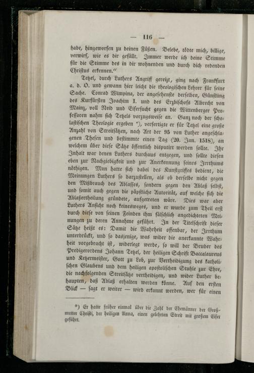 Tetzel, durch Luthers Angriff gereizt, ging nach Frankfurt a. d. O. und gewann hier leicht die theologiſchen Lehrer für feine Sache. Conrad Wimpina, der angeſehenſte derſelben, Guͤnſtling des Kurfuͤrſten Joachim J. und des Erzbiſchofs Albrecht von Mainz, voll Neid und Eiferſucht gegen die Wittenberger Pro— feſſoren nahm ſich Tetzels vorzugsweiſe an. Ganz noch der ſcho— laſtiſchen Theologie ergeben, verfertigte er für Tetzel eine große Anzahl von Streitſaͤtzen, nach Art der 95 von Luther angeſchla genen Theſen und beſtimmte einen Tag(20. Jan. 1518), an welchem uͤber dieſe Saͤtze oͤffentlich disputirt werden ſollte. Ihr Inhalt war denen Luthers durchaus entgegen, und ſollte dieſen eben zur Nachgiebigkeit und zur Anerkennung ſeines Irrthums noͤthigen. Man hatte ſich dabei des Kunſtgriffes bedient, die Meinungen Luthers ſo darzuſtellen, als ob derſelbe nicht gegen den Mißbrauch des Ablaſſes, ſondern gegen den Ablaß ſelbſt, und ſomit auch gegen die paͤpſtliche Autorität, auf welche ſich die Ablaßertheilung gründete, aufgetreten wäre. Dies war aber Luthers Anficht noch keinesweges, und er wurde zum Theil erſt durch dieſe von ſeinen Feinden ihm faͤlſchlich angedichteten Mei: nungen zu deren Annahme gefuͤhrt. In der Titelſchrift dieſer Saͤtze heißt es: Damit die Wahrheit offenbar, der Irrthum unterdruͤckt, und ſo dasjenige, was wider die anerkannte Wahr— heit vorgebracht iſt, widerlegt werde, ſo will der Bruder des Predigerordens Johann Tetzel, der heiligen Schrift Baccalaureus und Ketzermeiſter, Gott zu Lob, zur Vertheidigung des katholiſchen Glaubens und dem heiligen apoſtoliſchen Stuhle zur Ehre, die nachfolgenden Streitſaͤtze vertheidigen, und wider Luther be— haupten, daß Ablaß erhalten werden konne. Auf den erſten Blick— ſagt er weiter— wird erkannt werden, wer fuͤr einen