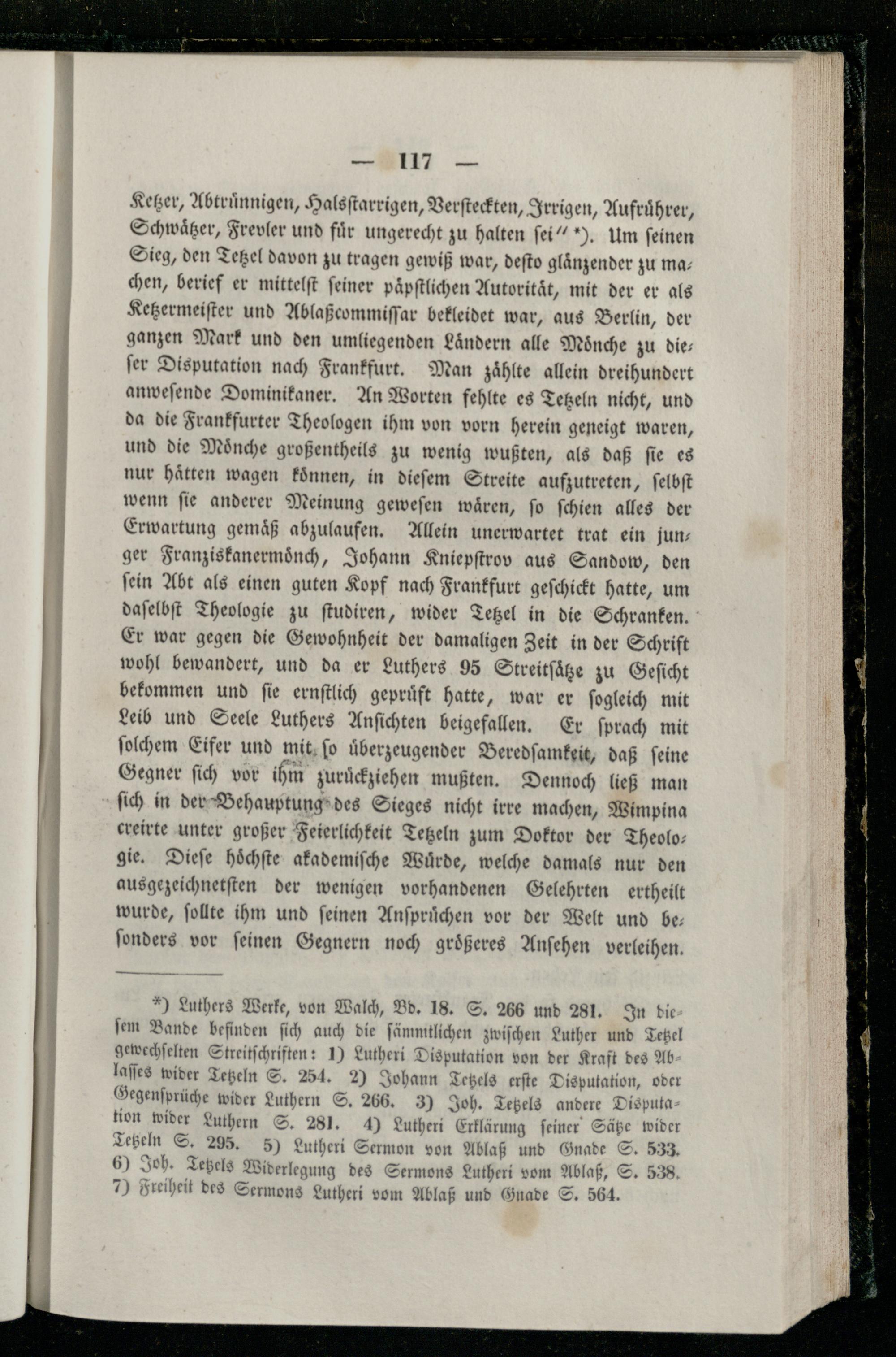 *) Luthers Werke, von Walch, Bd. 18. S. 2656 und 281. In die ſem Bande befinden ſich auch die ſämmtlichen zwiſchen Luther und Tetzel gewechſelten Streitſchriften: 1) Lutheri Disputation von der Kraft des Ab laſſes wider Tetzln S. 254. 2) Johann Tetzels erſte Disputation, oder Gegenſprüche wider Luthern S. 266. 3) Joh. Tetzels andere Disputa tion wider Luthern S. 281. 4) Lutheri Erklärung ſeiner Sätze wider Tetzeln S. 295. 5) Lutheri Sermon von Ablaß und Gnade S. 533. 6) Joh. Tetzels Widerlegung des Sermons Lutheri vom Ablaß, S. 538 7) Freiheit des Sermons Lutheri vom Ablaß und Gnade S. 564.