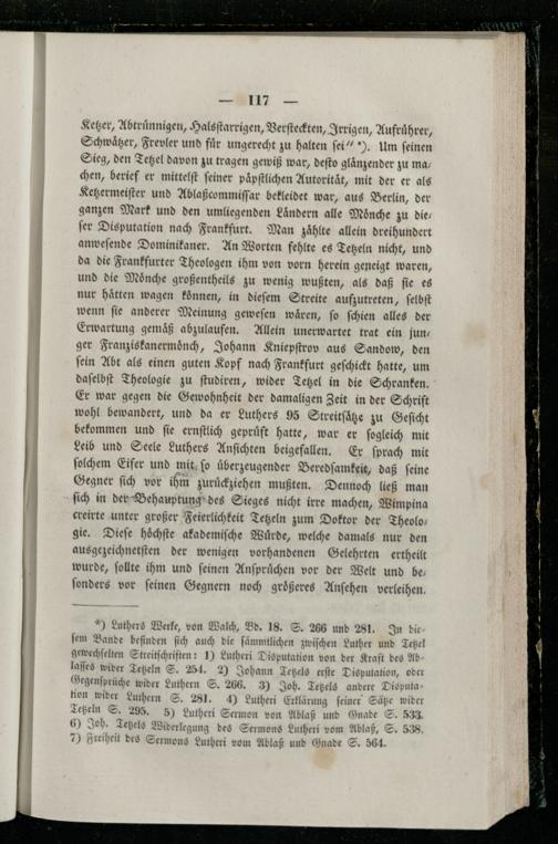 Ketzer, Abtruͤnnigen, Halsſtarrigen, Verſteckten, Irrigen, Aufruͤhrer, Schwaͤtzer, Frevler und fuͤr ungerecht zu halten ſei“). Um feinen Sieg, den Tetzel davon zu tragen gewiß war, deſto glaͤnzender zu ma; chen, berief er mittelſt ſeiner paͤpſtlichen Autorität, mit der er als Ketzermeiſter und Ablaßcommiſſar bekleidet war, aus Berlin, der ganzen Mark und den umliegenden Ländern alle Moͤnche zu dieſer Disputation nach Frankfurt. Man zaͤhlte allein dreihundert anweſende Dominikaner. An Worten fehlte es Tetzeln nicht, und da die Frankfurter Theologen ihm von vorn herein geneigt waren, und die Moͤnche großentheils zu wenig wußten, als daß ſie es nur hätten wagen können, in dieſem Streite aufzutreten, ſelbſt wenn ſie anderer Meinung geweſen wären, fo ſchien alles der Erwartung gemaͤß abzulaufen. Allein unerwartet trat ein junger Franziskanermoͤnch, Johann Kniepſtrov aus Sandow, den ſein Abt als einen guten Kopf nach Frankfurt geſchickt hatte, um daſelbſt Theologie zu ſtudiren, wider Tetzel in die Schranken. Er war gegen die Gewohnheit der damaligen Zeit in der Schrift wohl bewandert, und da er Luthers 95 Streitſaͤtze zu Geſicht bekommen und fie ernſtlich geprüft hatte, war er ſogleich mit Leib und Seele Luthers Anſichten beigefallen. Er ſprach mit ſolchem Eifer und mit ſo uͤberzeugender Beredſamkeit, daß ſeine Gegner ſich vor ihm zuruͤckziehen mußten. Dennoch ließ man ſich in der Behauptung des Sieges nicht irre machen, Wimpina creirte unter großer Feierlichkeit Tetzeln zum Doktor der Theolo— gie. Dieſe hoͤchſte akademiſche Wurde, welche damals nur den ausgezeichnetſten der wenigen vorhandenen Gelehrten ertheilt wurde, ſollte ihm und feinen Anſpruͤchen vor der Welt und be⸗ 1 ſonders vor feinen Gegnern noch groͤßeres Anſehen verleihen.