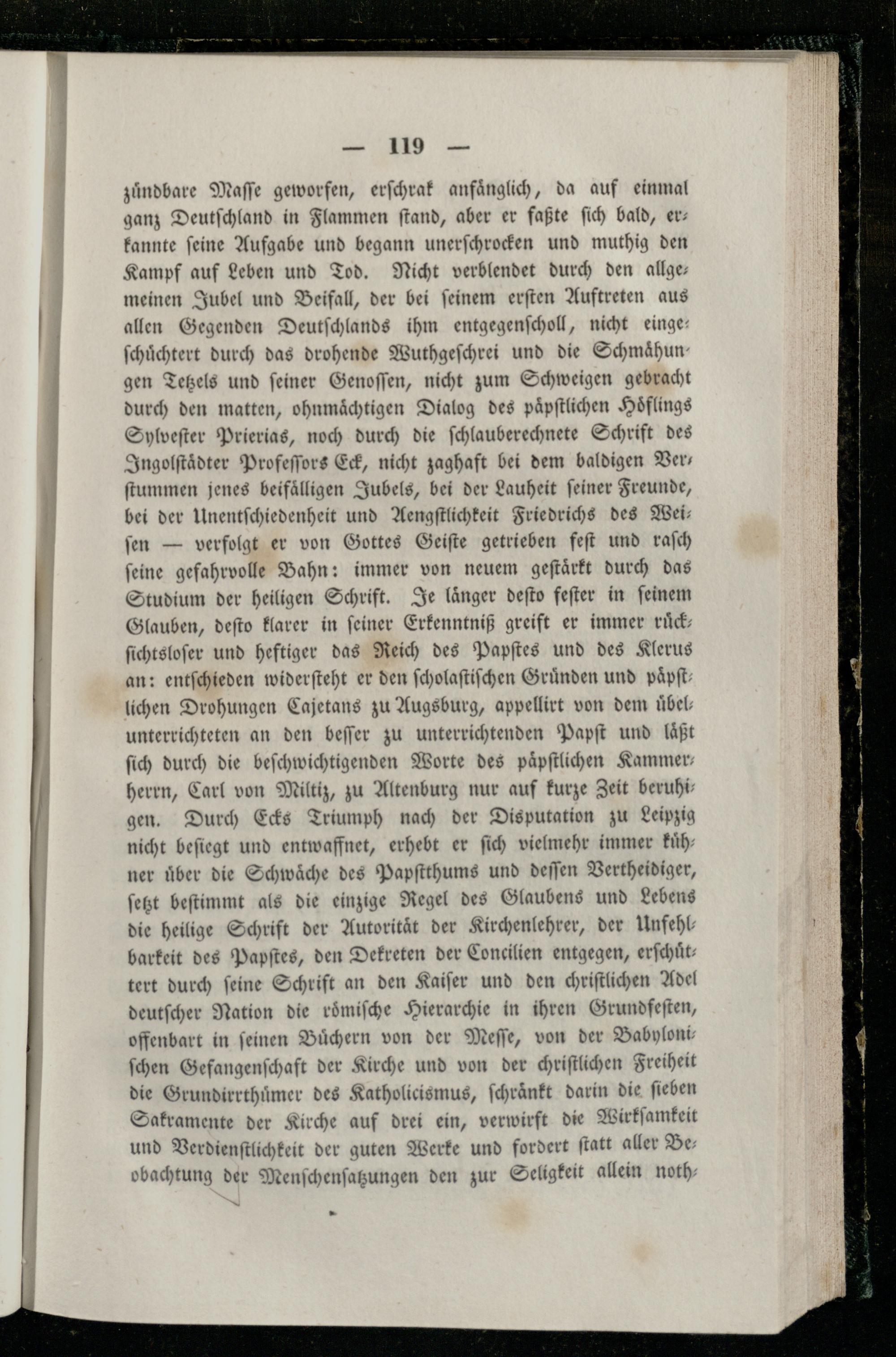 zuͤndbare Maſſe geworfen, erſchrak anfänglich, da auf einmal ganz Deutſchland in Flammen ſtand, aber er faßte ſich bald, er- kannte ſeine Aufgabe und begann unerſchrocken und muthig den Kampf auf Leben und Tod. Nicht verblendet durch den allge— meinen Jubel und Beifall, der bei ſeinem erſten Auftreten aus allen Gegenden Deutſchlands ihm entgegenſcholl, nicht einge— ſchuͤchtert durch das drohende Wuthgeſchrei und die Schmaͤhun gen Tetzels und ſeiner Genoſſen, nicht zum Schweigen gebracht durch den matten, ohnmaͤchtigen Dialog des paͤpſtlichen Hoͤflings Sylveſter Prierias, noch durch die ſchlauberechnete Schrift des Ingolſtaͤdter Profeſſors Eck, nicht zaghaft bei dem baldigen Vers ſtummen jenes beifaͤlligen Jubels, bei der Lauheit feiner Freunde, bei der Unentſchiedenheit und Aengſtlichkeit Friedrichs des Wei; ſen— verfolgt er von Gottes Geiſte getrieben feſt und raſch feine gefahrvolle Bahn: immer von neuem geſtaͤrkt durch das Studium der heiligen Schrift. Je länger deſto feſter in feinem Glauben, deſto klarer in ſeiner Erkenntniß greift er immer ruͤck— ſichtsloſer und heftiger das Reich des Papſtes und des Klerus an: entſchieden widerſteht er den ſcholaſtiſchen Gruͤnden und päpftlichen Drohungen Cajetans zu Augsburg, appellirt von dem uͤbel— unterrichteten an den beſſer zu unterrichtenden Papſt und laͤßt ſich durch die beſchwichtigenden Worte des paͤpſtlichen Kammer— herrn, Carl von Miltiz, zu Altenburg nur auf kurze Zeit beruhi— gen. Durch Ecks Triumph nach der Disputation zu Leipzig nicht beſiegt und entwaffnet, erhebt er ſich vielmehr immer kuͤh ner über die Schwäche des Papſtthums und deſſen Vertheidiger, ſetzt beſtimmt als die einzige Regel des Glaubens und Lebens die heilige Schrift der Autoritaͤt der Kirchenlehrer, der Unfehlbarkeit des Papſtes, den Dekreten der Concilien entgegen, erſchuͤttert durch ſeine Schrift an den Kaiſer und den chriſtlichen Adel deutſcher Nation die roͤmiſche Hierarchie in ihren Grundfeſten, offenbart in ſeinen Buͤchern von der Meſſe, von der Babyloniſchen Gefangenſchaft der Kirche und von der chriſtlichen Freiheit die Grundirrthuͤmer des Katholicismus, ſchraͤnkt darin die ſieben Sakramente der Kirche auf drei ein, verwirft die Wirkſamkeit und Verdienſtlichkeit der guten Werke und fordert ſtatt aller Beobachtung der Menſchenſatzungen den zur Seligkeit allein noth