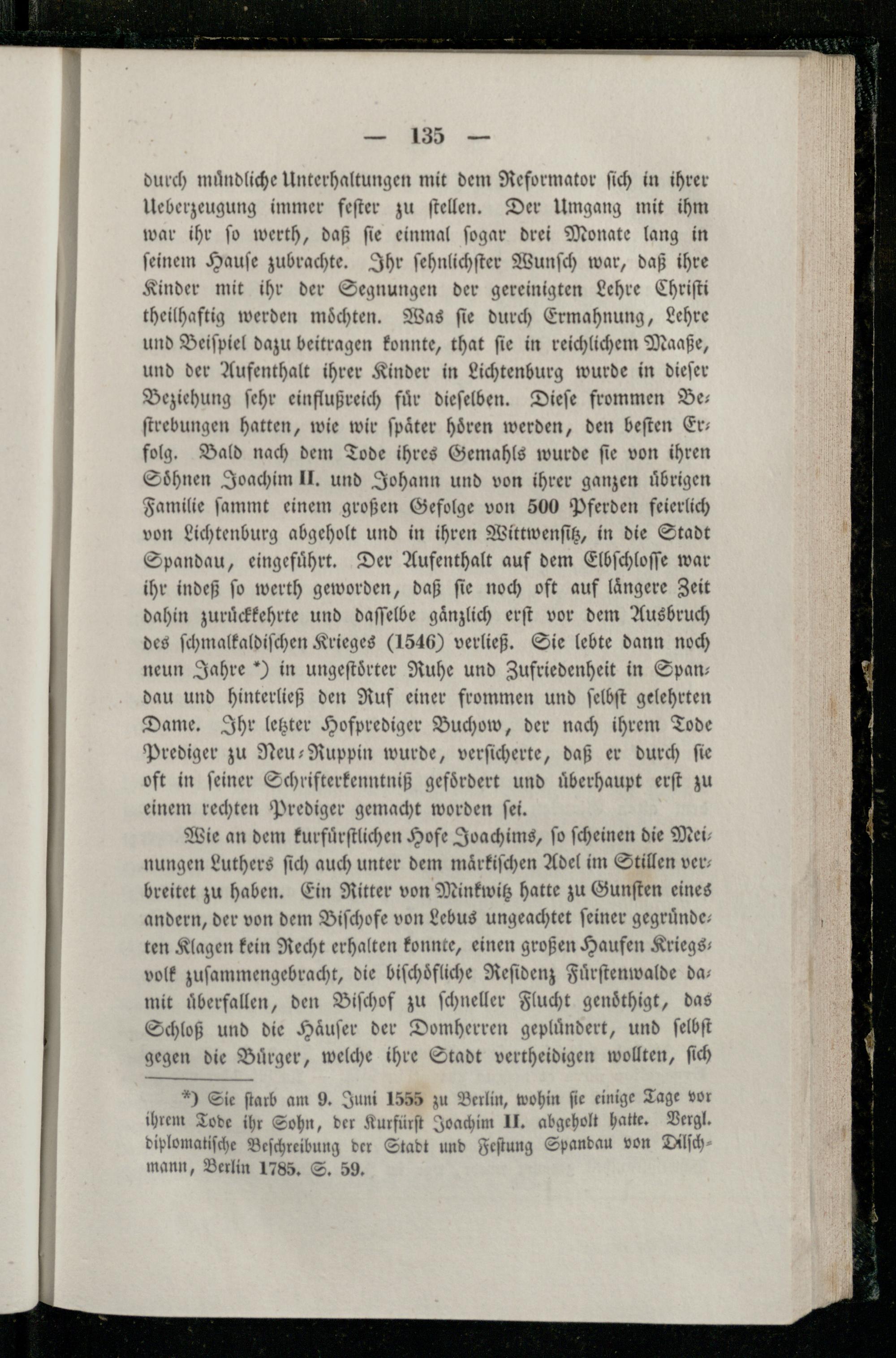 durch muͤndliche Unterhaltungen mit dem Reformator ſich in ihrer Ueberzeugung immer feſter zu ſtellen. Der Umgang mit ihm war ihr ſo werth, daß ſie einmal ſogar drei Monate lang in ſeinem Hauſe zubrachte. Ihr ſehnlichſter Wunſch war, daß ihre Kinder mit ihr der Segnungen der gereinigten Lehre Chriſti theilhaftig werden möchten. Was fie durch Ermahnung, Lehre und Beiſpiel dazu beitragen konnte, that ſie in reichlichem Maaße, und der Aufenthalt ihrer Kinder in Lichtenburg wurde in dieſer Beziehung ſehr einflußreich fuͤr dieſelben. Dieſe frommen Be— ſtrebungen hatten, wie wir ſpaͤter hören werden, den beſten Er— folg. Bald nach dem Tode ihres Gemahls wurde ſie von ihren Soͤhnen Joachim II. und Johann und von ihrer ganzen uͤbrigen Familie ſammt einem großen Gefolge von 500 Pferden feierlich von Lichtenburg abgeholt und in ihren Wittwenſitz, in die Stadt Spandau, eingefuͤhrt. Der Aufenthalt auf dem Elbſchloſſe war ihr indeß ſo werth geworden, daß ſie noch oft auf laͤngere Zeit dahin zuruͤckkehrte und daſſelbe gaͤnzlich erſt vor dem Ausbruch des ſchmalkaldiſchen Krieges(1546) verließ. Sie lebte dann noch neun Jahre*) in ungeſtoͤrter Ruhe und Zufriedenheit in Span: dau und hinterließ den Ruf einer frommen und ſelbſt gelehrten Dame. Ihr letzter Hofprediger Buchow, der nach ihrem Tode Prediger zu Neu-Ruppin wurde, verſicherte, daß er durch ſie oft in ſeiner Schrifterkenntniß gefoͤrdert und uͤberhaupt erſt zu einem rechten Prediger gemacht worden ſei.