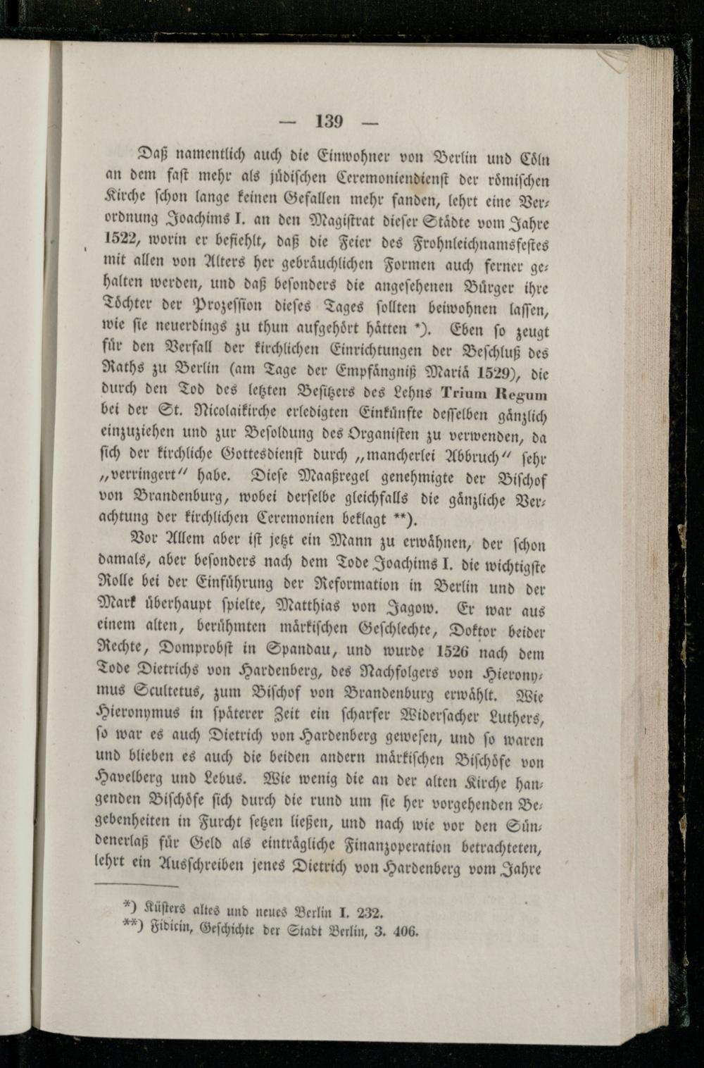 Vor Allem aber iſt jetzt ein Mann zu erwaͤhnen, der ſchon damals, aber beſonders nach dem Tode Joachims J. die wichtigſte Rolle bei der Einfuͤhrung der Reformation in Berlin und der Mark uͤberhaupt ſpielte, Matthias von Jagow. Er war aus einem alten, beruͤhmten maͤrkiſchen Geſchlechte, Doktor beider Rechte, Domprobſt in Spandau, und wurde 1526 nach dem Tode Dietrichs von Hardenberg, des Nachfolgers von Hieronymus Scultetus, zum Biſchof von Brandenburg erwaͤhlt. Wie Hieronymus in ſpaͤterer Zeit ein ſcharfer Widerſacher Luthers, ſo war es auch Dietrich von Hardenberg geweſen, und ſo waren und blieben es auch die beiden andern maͤrkiſchen Biſchoͤfe von Havelberg und Lebus. Wie wenig die an der alten Kirche han— genden Biſchoͤfe ſich durch die rund um fie her vorgehenden Be gebenheiten in Furcht ſetzen ließen, und nach wie vor den Suͤn— denerlaß für Geld als eintraͤgliche Finanzoperation betrachteten, lehrt ein Ausſchreiben jenes Dietrich von Hardenberg vom Jahre