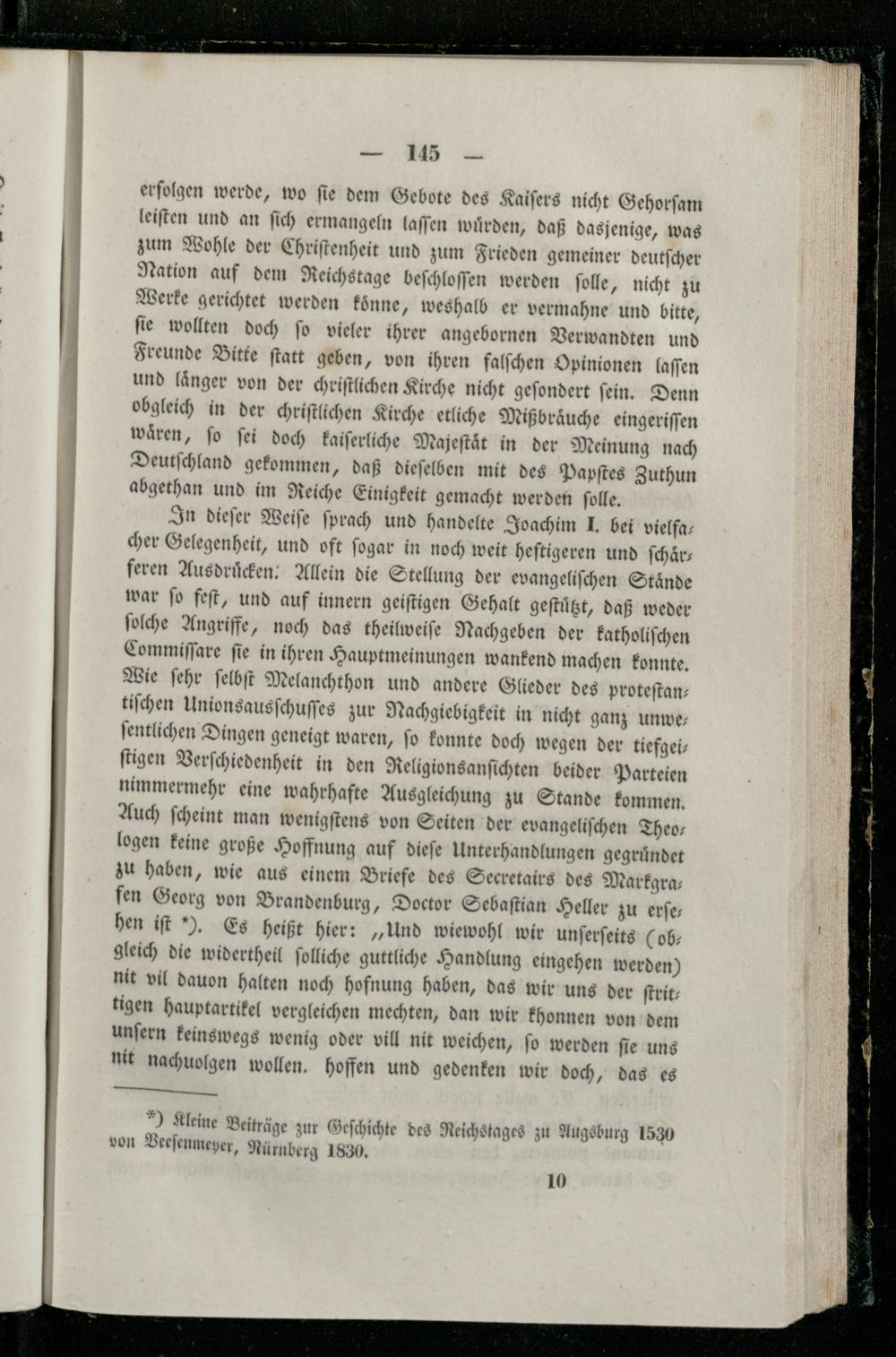 In dieſer Weiſe ſprach und handelte Joachim J. bei vielfacher Gelegenheit, und oft ſogar in noch weit heſtigeren und ſchaͤrferen Ausdrücken: Allein die Stellung der evangeliſchen Staͤnde war ſo feſt, und auf innern geiſtigen Gehalt geſtuͤtzt, daß weder ſolche Angriffe, noch das theilweiſe Nachgeben der katholiſchen Commiſſare ſie in ihren Hauptmeinungen wankend machen konnte. Wie ſehr ſelbſt Melanchthon und andere Glieder des proteſtantiſchen Unionsausſchuſſes zur Nachgiebigkeit in nicht ganz unweſentlichen Dingen geneigt waren, ſo konnte doch wegen der tiefgei— ſtigen Verſchiedenheit in den Religionsanſichten beider Parteien nimmermehr eine wahrhafte Ausgleichung zu Stande kommen. Auch ſcheint man wenigſtens von Seiten der evangeliſchen Theologen keine große Hoffnung auf dieſe Unterhandlungen gegruͤndet zu haben, wie aus einem Briefe des Secretairs des Markgrafen Georg von Brandenburg, Doctor Sebaſtian Heller zu erſehen iſt). Es heißt hier:„Und wiewohl wir unſerſeits(ob; gleich die widertheil ſolliche guttliche Handlung eingehen werden) nit vil dauon halten noch hofnung haben, das wir uns der ſtrittigen hauptartikel vergleichen mechten, dan wir khonnen von dem unſern keinswegs wenig oder vill nit weichen, ſo werden ſie uns nit nachuolgen wollen. hoffen und gedenken wir doch, das es ———