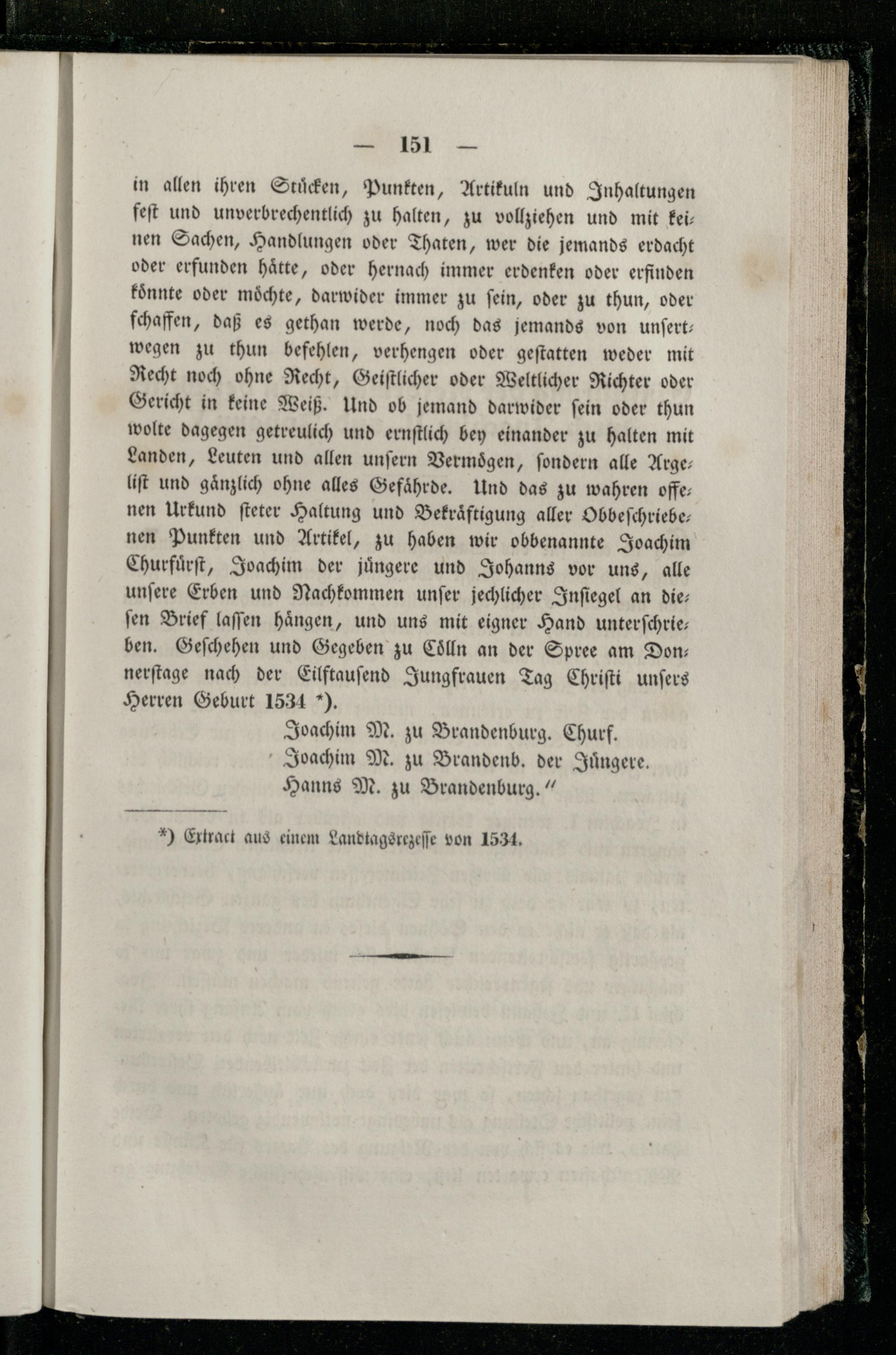 in allen ihren Stücken, Punkten, Artikuln und Inhaltungen feſt und unverbrechentlich zu halten, zu vollziehen und mit kei— nen Sachen, Handlungen oder Thaten, wer die jemands erdacht oder erfunden haͤtte, oder hernach immer erdenken oder erfinden koͤnnte oder möchte, darwider immer zu ſein, oder zu thun, oder fchaffen, daß es gethan werde, noch das jemands von unſert— wegen zu thun befehlen, verhengen oder geſtatten weder mit Recht noch ohne Recht, Geiſtlicher oder Weltlicher Richter oder Gericht in keine Weiß. Und ob jemand darwider ſein oder thun wolte dagegen getreulich und ernſtlich bey einander zu halten mit Landen, Leuten und allen unſern Vermögen, ſondern alle Arge— liſt und gaͤnzlich ohne alles Gefaͤhrde. Und das zu wahren offenen Urkund ſteter Haltung und Bekraͤftigung aller Obbeſchriebenen Punkten und Artikel, zu haben wir obbenannte Joachim Churfuͤrſt, Joachim der juͤngere und Johanns vor uns, alle unſere Erben und Nachkommen unſer jechlicher Inſiegel an die; ſen Brief laſſen haͤngen, und uns mit eigner Hand unterſchrieben. Geſchehen und Gegeben zu Coͤlln an der Spree am Don— nerſtage nach der Eilftauſend Jungfrauen Tag Chriſti unſers Herren Geburt 1531 5).