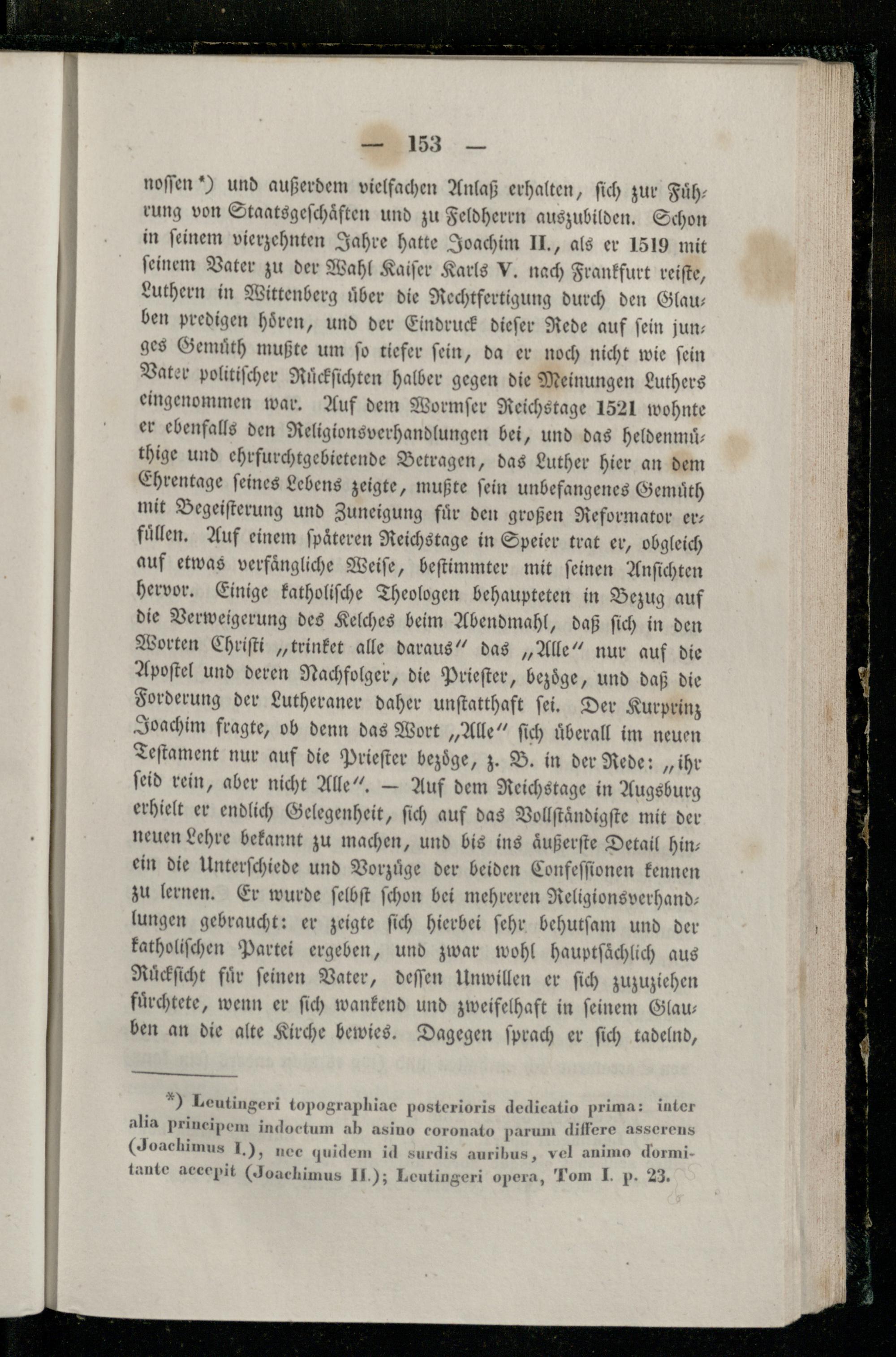noſſen) und außerdem vielfachen Anlaß erhalten, ſich zur Fuͤh— rung von Staatsgeſchaͤften und zu Feldherrn auszubilden. Schon in ſeinem vierzehnten Jahre hatte Joachim II., als er 1519 mit ſeinem Vater zu der Wahl Kaiſer Karls V. nach Frankfurt reiſte, Luthern in Wittenberg uͤber die Rechtfertigung durch den Glau— ben predigen hoͤren, und der Eindruck dieſer Rede auf ſein jun— ges Gemuͤth mußte um fo tiefer ſein, da er noch nicht wie ſein Vater politiſcher Ruͤckſichten halber gegen die Meinungen Luthers eingenommen war. Auf dem Wormſer Reichstage 1521 wohnte er ebenfalls den Religions verhandlungen bei, und das heldenmuͤthige und ehrfurchtgebietende Betragen, das Luther hier an dem Ehrentage ſeines Lebens zeigte, mußte ſein unbefangenes Gemuͤth mit Begeiſterung und Zuneigung fuͤr den großen Reformator er— fuͤllen. Auf einem ſpaͤteren Reichstage in Speier trat er, obgleich auf etwas verfaͤngliche Weiſe, beſtimmter mit ſeinen Anſichten hervor. Einige katholiſche Theologen behaupteten in Bezug auf die Verweigerung des Kelches beim Abendmahl, daß ſich in den Worten Chriſti„trinket alle daraus“ das„Alle“ nur auf die Apoſtel und deren Nachfolger, die Prieſter, bezoͤge, und daß die Forderung der Lutheraner daher unſtatthaft ſei. Der Kurprinz Joachim fragte, ob denn das Wort„Alle“ ſich uͤberall im neuen Teſtament nur auf die Prieſter bezöge, z. B. in der Rede:„ihr ſeid rein, aber nicht Alle“.— Auf dem Reichstage in Augsburg erhielt er endlich Gelegenheit, ſich auf das Vollſtaͤndigſte mit der neuen Lehre bekannt zu machen, und bis ins aͤußerſte Detail hinein die Unterſchiede und Vorzuͤge der beiden Confeſſionen kennen zu lernen. Er wurde ſelbſt ſchon bei mehreren Religionsverhand— lungen gebraucht: er zeigte ſich hierbei ſehr behutſam und der katholiſchen Partei ergeben, und zwar wohl hauptſaͤchlich aus Ruͤckſicht fuͤr ſeinen Vater, deſſen Unwillen er ſich zuzuziehen fuͤrchtete, wenn er ſich wankend und zweifelhaft in ſeinem Glau— ben an die alte Kirche bewies. Dagegen ſprach er ſich tadelnd,