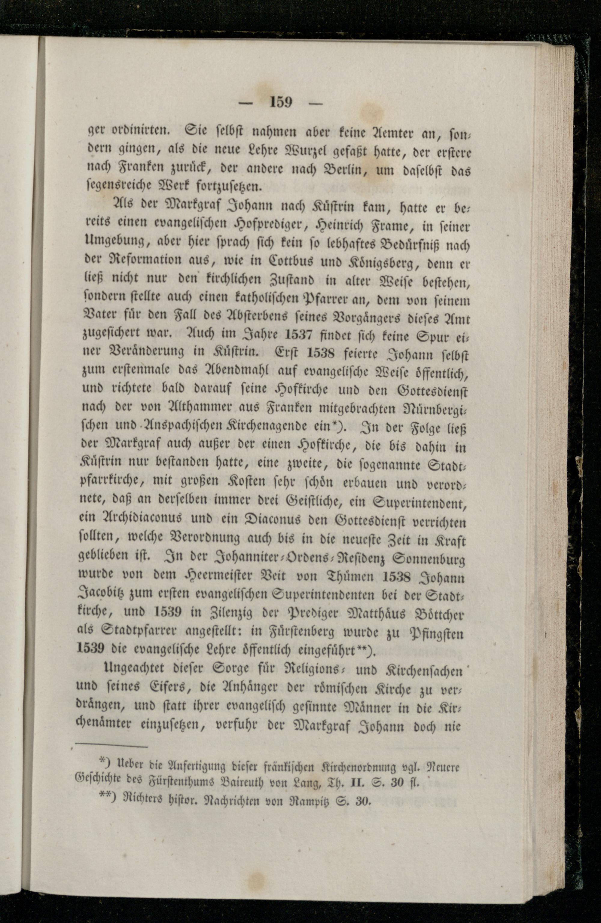 Als der Markgraf Johann nach Kuͤſtrin kam, hatte er be: reits einen evangeliſchen Hofprediger, Heinrich Frame, in ſeiner Umgebung, aber hier ſprach ſich kein ſo lebhaftes Beduͤrfniß nach der Reformation aus, wie in Cottbus und Koͤnigsberg, denn er ließ nicht nur den kirchlichen Zuſtand in alter Weiſe beſtehen, ſondern ſtellte auch einen katholiſchen Pfarrer an, dem von ſeinem Vater fuͤr den Fall des Abſterbens ſeines Vorgängers dieſes Amt zugeſichert war. Auch im Jahre 1537 findet ſich keine Spur ei: ner Veraͤnderung in Kuͤſtrin. Erſt 1538 feierte Johann ſelbſt zum erſtenmale das Abendmahl auf evangeliſche Weiſe Öffentlich, und richtete bald darauf feine Hofkirche und den Gottes dienſt nach der von Althammer aus Franken mitgebrachten Nuͤrnbergiſchen und Anspachiſchen Kirchenagende ein). In der Folge ließ der Markgraf auch außer der einen Hofkirche, die bis dahin in Kuͤſtrin nur beſtanden hatte, eine zweite, die ſogenannte Stadt— pfarrkirche, mit großen Koſten ſehr ſchoͤn erbauen und verordnete, daß an derſelben immer drei Geiſtliche, ein Superintendent, ein Archidiaconus und ein Diaconus den Gottesdienſt verrichten ſollten, welche Verordnung auch bis in die neueſte Zeit in Kraft geblieben iſt. In der Johanniter⸗Ordens⸗Reſidenz Sonnenburg wurde von dem Heermeiſter Veit von Thuͤmen 1538 Johann Jacobitz zum erſten evangeliſchen Superintendenten bei der Stadt: kirche, und 1539 in Zilenzig der Prediger Matthäus Böttcher als Stadtpfarrer angeſtellt: in Fuͤrſtenberg wurde zu Pfingſten 1539 die evangeliſche Lehre oͤffentlich eingefuͤhrt„).