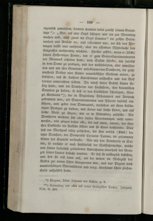 eigentlich gewaltſam, ſondern wendete dabei gemäß feinem Grund ſaze):„Wer auf eine Orgel ſchlagen und ein gut Motettlein machen will, muß zuvor die Orgel ſtimmen“ die größte Beſon nenheit und Umſicht an, und reformirte nur, wo ſich das Ver langen dafuͤr laut ausſprach, oder wo offenbare Mißbraͤuche ſein Eingreifen nothwendig machten. Hierher gehört, wenn er(1538) ſeinen Hofprediger Frame, den er zum Generalſuperintendenten der Neumark erhoben patte, nach Soldin ſchickte, um daſelbſt in dem Dome zu prediger„Und den wohllebenden, aber unwiſſenden und um ihre Gemeinde unbekuͤmmerten Domherrn, die groͤßtentheils Bruͤder oder Kinder neumaͤrkiſcher Edelleute waren, zu befehlen, daß ſie Luthers Katechismus anſchaffen und das Volk daraus unterrichten ſollten. Da indeß dieſer Befehl keinen Er— ſolg hatte, und die Domherrn nur fortfuhren, ihre kanoniſchen Stunden zu halten, ſo ließ er den fraͤnkiſchen Theologen, Wen— zel Kielmann**), der in Begleitung Althammers aus Anspach gekommen war, als Superintendenten und Pfarrer daſelbſt eins fuͤhren, und gebot dem Domcapitel, denſelben als ihren beſtaͤn— digen Prediger zu dulden, und ferner nur ſolche Lieder, und auf ſolche Weiſe zu ſingen, wie es in Wittenberg geſchaͤhe. Die Domherrn mochten ſich aber dieſen Verordnungen nicht unter