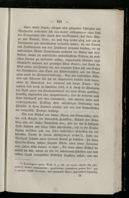 Mit dem Biſchof von Lebus, Georg von Blumenthal, aber, der auch Kanzler der Univerſitaͤt Frankfurt, Biſchof von Natzeburg und als ſolcher Reichsfuͤrſt war, und der mit ſo heftigem Haſſe Luthern und ſeiner Lehre widerſtrebte, daß er die Beguͤnſtigung derſelben und das Leſen lutheriſcher Schriften bei der haͤrteſten Strafe in feinem Kirchſprengel verbot), hatte der Markgraf Johann einen haͤrteren Kampf zu beſtehen. Zu ſeiner Charakteriſirung moͤgen folgende Worte eines ſeiner Lobredner vom Jahre 1534 dienen; er ſagt:„Als einen echten Biſchof beweiſeſt du dich, indem du das dir anvertraute Haͤuflein aus dem reichen Quell evangeliſcher Wahrheit ſorgfaͤltig naͤhrſt, und aus