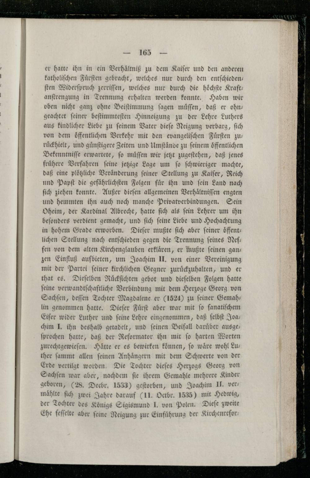 er hatte ihn in ein Verhaͤltniß zu dem Kaiſer und den anderen katholiſchen Fuͤrſten gebracht, welches nur durch den entſchieden— ſten Widerſpruch zerriſſen, welches nur durch die hoͤchſte Kraft— anſtrengung in Trennung erhalten werden konnte. Haben wir oben nicht ganz ohne Beiſtimmung ſagen muͤſſen, daß er ohn— geachtet ſeiner beſtimmteſten Hinneigung zu der Lehre Luthers aus kindlicher Liebe zu ſeinem Vater dieſe Neigung verbarg, ſich von dem öffentlichen Verkehr mit den evangeliſchen Fuͤrſten zu— ruͤckhielt, und guͤnſtigere Zeiten und Umſtaͤnde zu ſeinem oͤffentlichen Bekenntniſſe erwartete, ſo muͤſſen wir jetzt zugeſtehen, daß jenes fruͤhere Verfahren ſeine jetzige Lage um ſo ſchwieriger machte, daß eine ploͤtzliche Veränderung feiner Stellung zu Kaiſer, Reich nnd Papſt die gefaͤhrlichſten Folgen für ihn und fein Land nach ſich ziehen konnte. Außer dieſen allgemeinen Verhaͤltniſſen engten und hemmten ihn auch noch manche Privatverbindungen. Sein Oheim, der Kardinal Albrecht, hatte ſich als ſein Lehrer um ihn beſonders verdient gemacht, und ſich ſeine Liebe und Hochachtung in hohem Grade erworben. Dieſer mußte ſich aber feiner oͤffent— lichen Stellung nach entſchieden gegen die Trennung ſeines Nef— fen von dem alten Kirchenglauben erklaͤren, er mußte ſeinen gan— zen Einfluß aufbieten, um Joachim II. von einer Vereinigung mit der Partei ſeiner kirchlichen Gegner zuruͤckzuhalten, und er that es. Dieſelben Ruͤckſichten gebot und dieſelben Folgen hatte ſeine verwandtſchaftliche Verbindung mit dem Herzoge Georg von Sachſen, deſſen Tochter Magdalene er(1524) zu feiner Gemah— lin genommen hatte. Dieſer Fuͤrſt aber war mit ſo fanatiſchem Eifer wider Luther und ſeine Lehre eingenommen, daß ſelbſt Joa— chim J. ihn deshalb getadelt, und feinen Beifall daruͤber ausge; ſprochen hatte, daß der Reformator ihn mit ſo harten Worten zurechtgewieſen. Hätte er es bewirken koͤnnen, fo wäre wohl Lu— ther ſammt allen ſeinen Anhaͤngern mit dem Schwerte von der Erde vertilgt worden. Die Tochter dieſes Herzogs Georg von Sachſen war aber, nachdem ſie ihrem Gemahle mehrere Kinder geboren,(28. Decbr. 1533) geſtorben, und Joachim II. ver maͤhlte ſich zwei Jahre darauf(11. Octbr. 1535) mit Hedwig, der Tochter des Königs Sigismund J. von Polen. Dieſe zweite