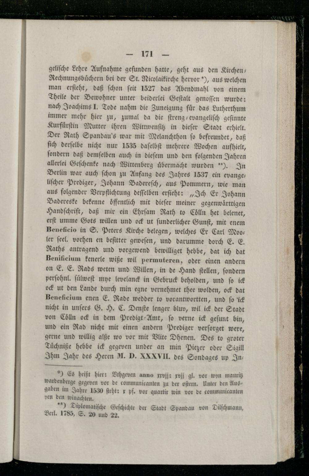 geliſche Lehre Aufnahme gefunden hatte, geht aus den Kirchen Rechnungsbuͤchern bei der St. Nicolaikirche hervor‘), aus welchen man erſieht, daß ſchon ſeit 1527 das Abendmahl von einem Theile der Bewohner unter beiderlei Geſtalt genoſſen wurde: nach Joachims J. Tode nahm die Zuneigung fuͤr das Lutherthum immer mehr hier zu, zumal da die ſtreng-evangeliſch geſinnte Kurfuͤrſtin Mutter ihren Wittwenſitz in dieſer Stadt erhielt. Der Rath Spandau's war mit Melanchthon ſo befreundet, daß ſich derſelbe nicht nur 1535 daſelbſt mehrere Wochen aufhielt, ſondern daß demſelben auch in dieſem und den folgenden Jahren allerlei Geſchenke nach Wittenberg uͤbermacht wurden). In Berlin war auch ſchon zu Anfang des Jahres 1537 ein evange— liſcher Prediger, Johann Badereſch, aus Pommern, wie man aus folgender Verpflichtung deſſelben erſieht:„Ich Er Johann Badereske bekenne oͤffentlich mit dieſer meiner gegenwaͤrttigen Handſchrift, daß mir ein Ehrſam Rath to Coͤlln het belenet, erſt umme Gots willen und ock ut ſunderlicher Gunſt, mit enem Beneficio in S. Peters Kirche belegen, welches Er Carl Moo— ler feel, vorhen en beſitter geweſen, und darumme dorch E. E. Raths antragend und vorgewend bewilliget hebbe, dat ich dat Beniſicium kenerle wiße wil permuteren, oder einen andern on E. E. Rads weten und Willen, in de Hand ſtellen, ſondern perſohnl. ſuͤlweſt mye levelanck in Gebruck beholden, und ſo ick ock ut den Lande durch min egne vernehmet thee wolden, ock dat Beneſicium enen E. Rade wedder to vorantwortten, und ſo ick nicht in unſers G. H. C. Denſte lenger bluv, wil ick der Stadt von Coͤlln ock in dem Predigt-Amt, ſo verne ick geſunt bin, und ein Rad nicht mit einen andern Prediger verſorget were, gerne und willig alße wo vor mit Vlite Dhenen. Des to groter Tuͤchniße hebbe ick gegeven under an min Piezer oder Sigill Ihm Jahr des Heren M. D. XXVII. des Sondages up In