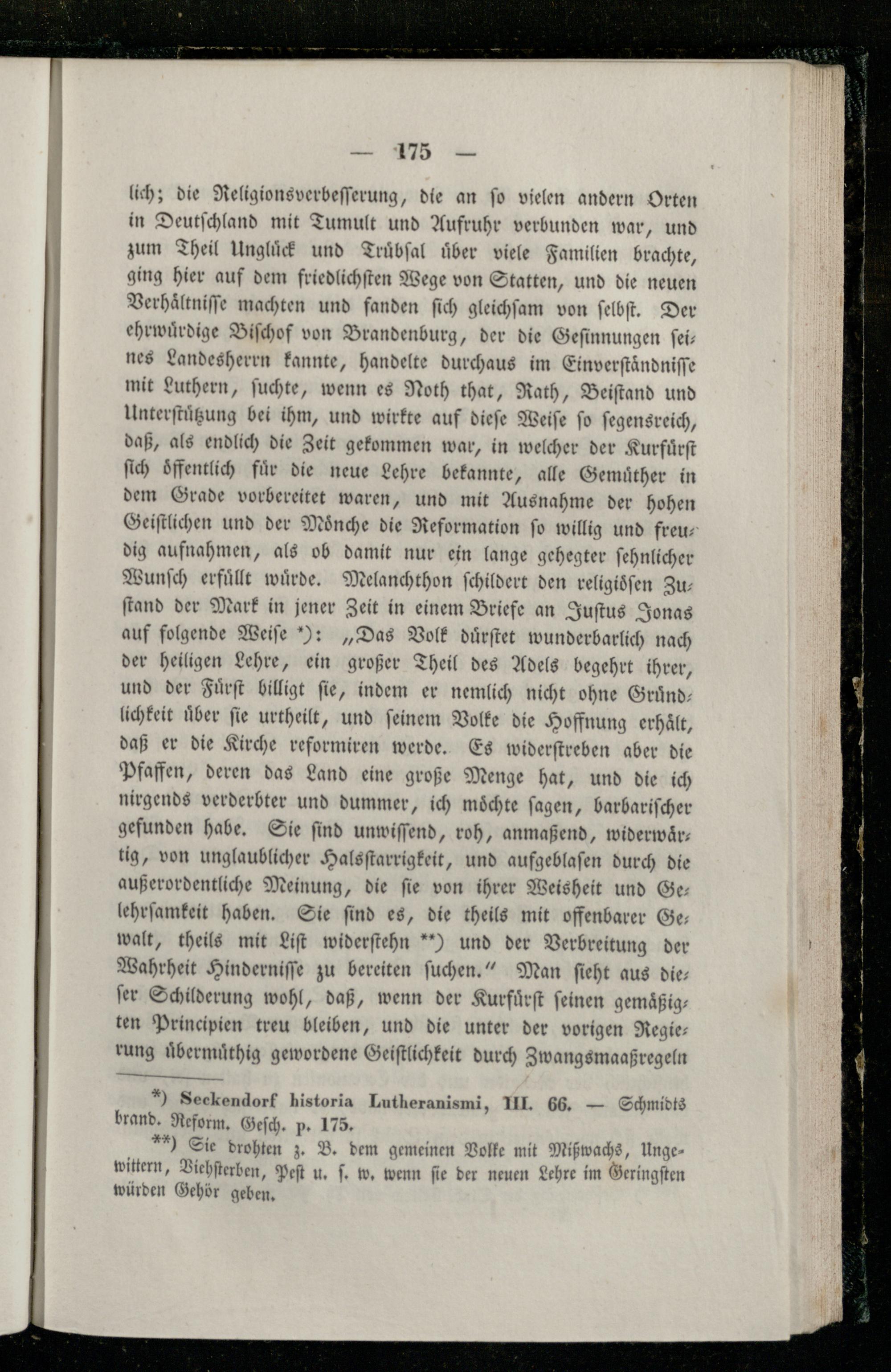 lich; die Religionsverbeſſerung, die an fo vielen andern Orten in Deutſchland mit Tumult und Aufruhr verbunden war, und zum Theil Ungluͤck und Truͤbſal uͤber viele Familien brachte, ging hier auf dem friedlichſten Wege von Statten, und die neuen Verhaͤltniſſe machten und fanden ſich gleichſam von ſelbſt. Der ehrwuͤrdige Biſchof von Brandenburg, der die Geſinnungen ſeines Landesherrn kannte, handelte durchaus im Einverſtaͤndniſſe mit Luthern, ſuchte, wenn es Noth that, Rath, Beiſtand und Unterſtuͤtzung bei ihm, und wirkte auf dieſe Weiſe ſo ſegensreich, daß, als endlich die Zeit gekommen war, in welcher der Kurfuͤrſt ſich oͤffentlich fuͤr die neue Lehre bekannte, alle Gemuͤther in dem Grade vorbereitet waren, und mit Ausnahme der hohen Geiſtlichen und der Moͤnche die Reformation ſo willig und freudig aufnahmen, als ob damit nur ein lange gehegter ſehnlicher Wunſch erfuͤllt wuͤrde. Melanchthon ſchildert den religioͤſen Zuſtand der Mark in jener Zeit in einem Briefe an Juſtus Jonas auf folgende Weiſe):„Das Volk duͤrſtet wunderbarlich nach der heiligen Lehre, ein großer Theil des Adels begehrt ihrer, und der Fuͤrſt billigt ſie, indem er nemlich nicht ohne Gruͤndlichkeit uͤber ſie urtheilt, und ſeinem Volke die Hoffnung erhaͤlt, daß er die Kirche reformiren werde. Es widerſtreben aber die Pfaffen, deren das Land eine große Menge hat, und die ich nirgends verderbter und dummer, ich moͤchte ſagen, barbariſcher gefunden habe. Sie ſind unwiſſend, roh, anmaßend, widerwaͤrtig, von unglaublicher Halsſtarrigkeit, und aufgeblaſen durch die außerordentliche Meinung, die ſie von ihrer Weisheit und Ge— lehrſamkeit haben. Sie ſind es, die theils mit offenbarer Ge— walt, theils mit Liſt widerſtehn“) und der Verbreitung der Wahrheit Hinderniſſe zu bereiten ſuchen.“ Man ſieht aus dieſer Schilderung wohl, daß, wenn der Kurfuͤrſt feinen gemaͤßigten Principien treu bleiben, und die unter der vorigen Regierung uͤbermuͤthig gewordene Geiſtlichkeit durch Zwangsmaaßregeln