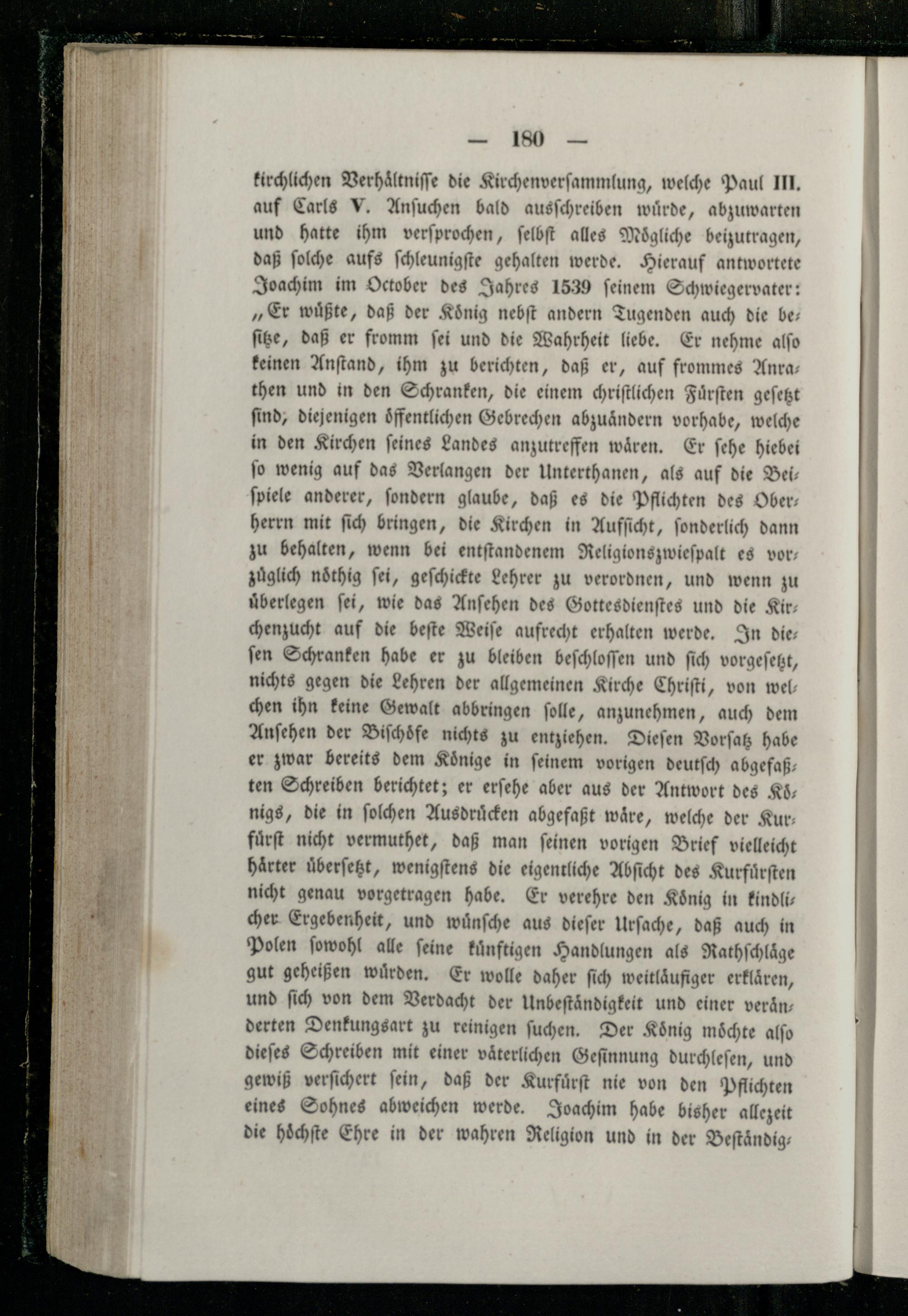 kirchlichen Verhaͤltniſſe die Kirchenverſammlung, welche Paul III. auf Carls V. Anſuchen bald ausſchreiben würde, abzuwarten und hatte ihm verſprochen, ſelbſt alles Mögliche beizutragen, daß ſolche aufs ſchleunigſte gehalten werde. Hierauf antwortete Joachim im October des Jahres 1539 feinem Schwiegervater: „Er wüßte, daß der König nebſt andern Tugenden auch die be: ſitze, daß er fromm ſei und die Wahrheit liebe. Er nehme alſo keinen Anſtand, ihm zu berichten, daß er, auf frommes Anra— then und in den Schranken, die einem chriſtlichen Fuͤrſten geſetzt find; diejenigen Öffentlichen Gebrechen abzuändern vorhabe, welche in den Kirchen feines Landes anzutreffen wären. Er ſehe hiebei fo wenig auf das Verlangen der Unterthanen, als auf die Bei ſpiele anderer, ſondern glaube, daß es die Pflichten des Ober— herrn mit ſich bringen, die Kirchen in Auſſicht, ſonderlich dann zu behalten, wenn bei entſtandenem Religionszwieſpalt es vor zuͤglich noͤthig ſei, geſchickte Lehrer zu verordnen, und wenn zu überlegen ſei, wie das Anſehen des Gottesdienſtes und die Kir chenzucht auf die beſte Weiſe aufrecht erhalten werde. In die— ſen Schranken habe er zu bleiben beſchloſſen und ſich vorgeſetzt, nichts gegen die Lehren der allgemeinen Kirche Chriſti, von wel chen ihn keine Gewalt abbringen ſolle, anzunehmen, auch dem Anſehen der Biſchsͤfe nichts zu entziehen. Dieſen Vorſatz habe er zwar bereits dem Könige in feinem vorigen deutſch abgefaß— ten Schreiben berichtet; er erſehe aber aus der Antwort des Köͤ— nigs, die in ſolchen Ausdruͤcken abgefaßt waͤre, welche der Kur fuͤrſt nicht vermuthet, daß man ſeinen vorigen Brief vielleicht haͤrter uͤberſetzt, wenigſtens die eigentliche Abſicht des Kurfuͤrſten nicht genau vorgetragen habe. Er verehre den König in kindli— cher Ergebenheit, und wuͤnſche aus dieſer Urſache, daß auch in Polen ſowohl alle ſeine kuͤnftigen Handlungen als Rathſchlaͤge gut geheißen wuͤrden. Er wolle daher ſich weitlaͤufiger erklaͤren, und ſich von dem Verdacht der Unbeſtändigkeit und einer veraͤn— derten Denkungsart zu reinigen ſuchen. Der König möchte alſo diefes Schreiben mit einer väterlichen Geſinnung durchlefen, und gewiß verſichert fein, daß der Kurfuͤrſt nie von den Pflichten eines Sohnes abweichen werde. Joachim habe bisher allezeit die hoͤchſte Ehre in der wahren Religion und in der Beſtaͤndig