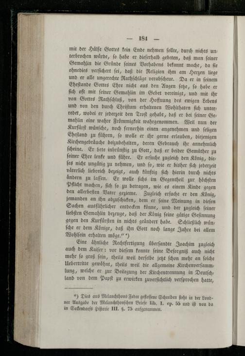 Eine aͤhnliche Rechtfertigung uͤberſandte Joachim zugleich auch dem Kaiſer: vor dieſem konnte ſeine Beſorgniß auch nicht mehr ſo groß ſein, theils weil derſelbe jetzt ſchon mehr an ſolche Uebertritte gewöhnt, theils weil die allgemeine Kirchenverſammlung, welche er zur Beilegung der Kirchentrennung in Deutſchland von dem Papſt zu erwirken zuverſichtlich verſprochen hatte,