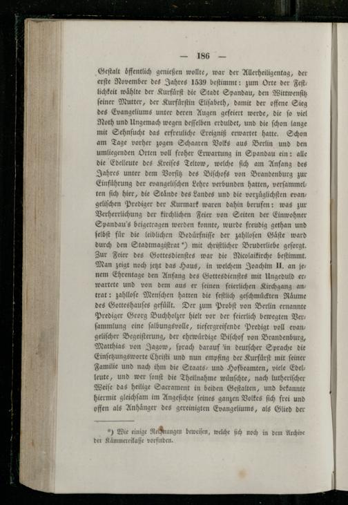 Geſtalt Öffentlich genießen wollte, war der Allerheiligentag, der erſte November des Jahres 1539 beſtimmt: zum Orte der Feſt— lichkeit wählte der Kurfuͤrſt die Stadt Spandau, den Wittwenſitz ſeiner Mutter, der Kurfuͤrſtin Eliſabeth, damit der offene Sieg des Evangeliums unter deren Augen gefeiert werde, die ſo viel Noth und Ungemach wegen deſſelben erduldet, und die ſchon lange mit Sehnſucht das erfreuliche Ereigniß erwartet hatte. Schon am Tage vorher zogen Schaaren Volks aus Berlin und den umliegenden Orten voll froher Erwartung in Spandau ein: alle die Edelleute des Kreiſes Teltow, welche ſich am Anfang des Jahres unter dem Vorſitz des Biſchofs von Brandenburg zur Einführung der evangeliſchen Lehre verbunden hatten, verſammel ten ſich hier, die Staͤnde des Landes und die vorzuͤglichſten evan— geliſchen Prediger der Kurmark waren dahin berufen: was zur Verherrlichung der kirchlichen Feier von Seiten der Einwohner Spandauss beigetragen werden konnte, wurde freudig gethan und ſelbſt fuͤr die leiblichen Beduͤrfniſſe der zahlloſen Gaͤſte ward durch den Stadtmagiftrat*) mit chriſtlicher Bruderliebe geſorgt. Zur Feier des Gottesdienſtes war die Nicolaikirche beſtimmt. Man zeigt noch jetzt das Haus, in welchem Joachim II. an je— nem Ehrentage den Anfang des Gottesdienſtes mit Ungeduld ev wartete und von dem aus er ſeinen feierlichen Kirchgang an trat: zahlloſe Menſchen hatten die feſtlich geſchmuͤckten Räume des Gotteshauſes gefuͤllt. Der zum Probſt von Berlin ernannte Prediger Georg Buchholzer hielt vor der feierlich bewegten Ver ſammlung eine ſalbungsvolle, tiefergreifende Predigt voll evan— geliſcher Begeiſterung, der ehrwuͤrdige. von Brandenburg, Matthias von Jagow, ſprach darauf in deutſcher Sprache die Einſetzungsworte Chriſti und nun empfing der Kurfuͤrſt mit ſeiner Familie und nach ihm die Staats- und Hofbeamten, viele Edel leute, und wer ſonſt die Theilnahme wuͤnſchte, nach lutheriſcher Weiſe das heilige an, in beiden Geſtalten, und bekannte hiermit gleichſam im Angeſichte ſeines ganzen Volkes ſich frei und offen als Anhaͤnger des gereinigten Evangeliums, als Glied der