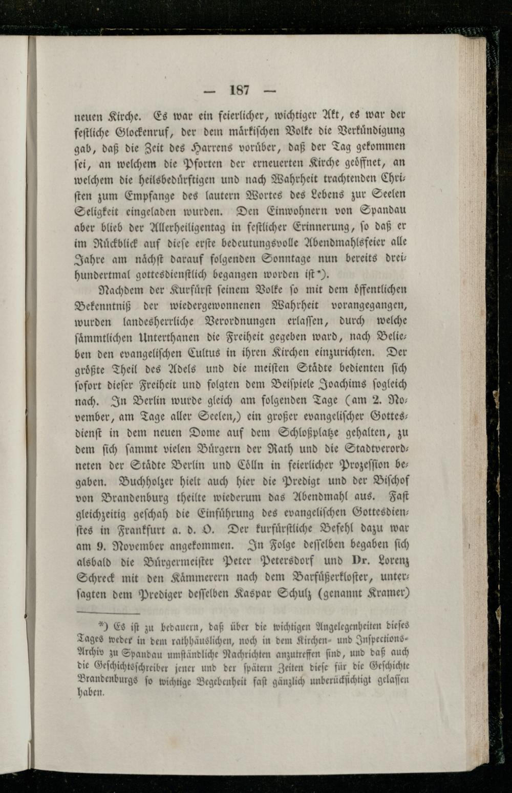 Nachdem der Kurfuͤrſt feinem Volke fo mit dem oͤffentlichen Bekenntniß der wiedergewonnenen Wahrheit vorangegangen, wurden landesherrliche Verordnungen erlaſſen, durch welche ſaͤmmtlichen Unterthanen die Freiheit gegeben ward, nach Belie— ben den evangeliſchen Cultus in ihren Kirchen einzurichten. Der groͤßte Theil des Adels und die meiſten Staͤdte bedienten ſich ſofort dieſer Freiheit und folgten dem Beiſpiele Joachims ſogleich nach. In Berlin wurde gleich am folgenden Tage(am 2. No— vember, am Tage aller Seelen,) ein großer evangeliſcher Gottes— dienſt in dem neuen Dome auf dem Schloßplatze gehalten, zu dem ſich ſammt vielen Bürgern der Rath und die Stadtverord— neten der Städte Berlin und Coͤlln in feierlicher Prozeſſion begaben. Buchholzer hielt auch hier die Predigt und der Biſchof von Brandenburg theilte wiederum das Abendmahl aus. Faſt gleichzeitig geſchah die Einfuͤhrung des evangeliſchen Gottesdienſtes in Frankfurt a. d. O. Der kurfuͤrſtliche Befehl dazu war am 9. November angekommen. In Folge deſſelben begaben ſich alsbald die Buͤrgermeiſter Peter Petersdorf und Dr. Lorenz Schreck mit den Kaͤmmerern nach dem Barfuͤßerkloſter, unter: ſagten dem Prediger deſſelben Kaspar Schulz(genannt Kramer)