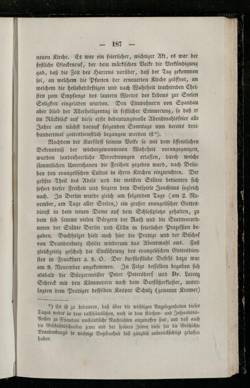 neuen Kirche. Es war ein feierlicher, wichtiger Akt, es war der feſtliche Glockenruf, der dem maͤrkiſchen Volke die Verkündigung gab, daß die Zeit des Harrens voruͤber, daß der Tag gekommen ſei, an welchem die Pforten der erneuerten Kirche geoͤffnet, an welchem die heilsbeduͤrftigen und nach Wahrheit trachtenden Chri— ſten zum Empfange des lautern Wortes des Lebens zur Seelen Seligkeit eingeladen wurden. Den Einwohnern von Spandau aber blieb der Allerheiligentag in feſtlicher Erinnerung, ſo daß er im Ruͤckblick auf dieſe erſte bedeutungsvolle Abendmahlsfeier alle Jahre am naͤchſt darauf folgenden Sonntage nun bereits drei— hundertmal gottesdienſtlich begangen worden iſt).