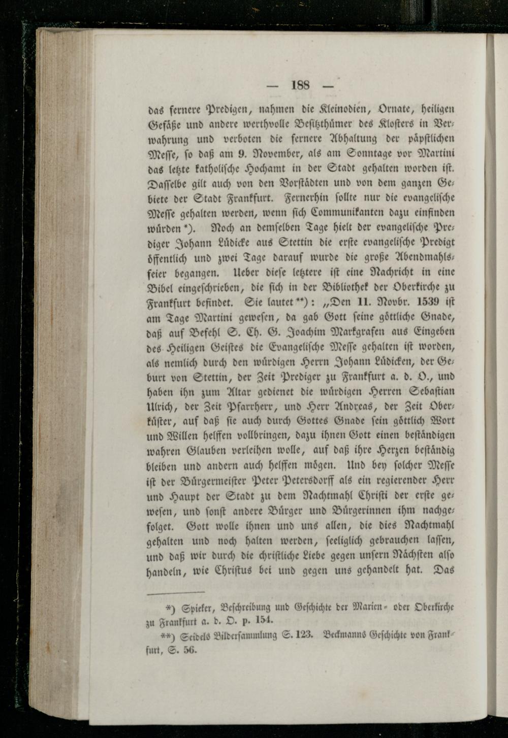 das fernere Predigen, nahmen die Kleinodien, Ornate, heiligen Gefäße und andere werthvolle Beſitzthuͤmer des Kloſters in Ver wahrung und verboten die fernere Abhaltung der paͤpſtlichen Meſſe, ſo daß am 9. November, als am Sonntage vor Martini das letzte katholiſche Hochamt in der Stadt gehalten worden iſt. Daſſelbe gilt auch von den Vorſtaͤdten und von dem ganzen Ge biete der Stadt Frankfurt. Fernerhin ſollte nur die evangeliſche Meſſe gehalten werden, wenn ſich Communikanten dazu einfinden wuͤrden). Noch an demſelben Tage hielt der evangeliſche Pre— diger Johann Luͤdicke aus Stettin die erſte evangeliſche Predigt oͤffentlich und zwei Tage darauf wurde die große Abendmahls— feier begangen. Ueber dieſe letztere iſt eine Nachricht in eine Bibel eingeſchrieben, die ſich in der Bibliothek der Oberkirche zu Frankfurt befindet. Sie lautet“):„Den 11. Novbr. 1539 iſt am Tage Martini geweſen, da gab Gott ſeine goͤttliche Gnade, daß auf Befehl S. Ch. G. Joachim Markgrafen aus Eingeben des Heiligen Geiſtes die Evangeliſche Meſſe gehalten iſt worden, als nemlich durch den wuͤrdigen Herrn Johann Luͤdicken, der Ge— burt von Stettin, der Zeit Prediger zu Frankfurt a. d. O., und haben ihn zum Altar gedienet die würdigen Herren Sebaſtian Ulrich, der Zeit Pfarrherr, und Herr Andreas, der Zeit Ober— kuͤſter, auf daß fie auch durch Gottes Gnade fein göttlich Wort und Willen helffen vollbringen, dazu ihnen Gott einen beſtaͤndigen wahren Glauben verleihen wolle, auf daß ihre Herzen beſtaͤndig bleiben und andern auch helffen moͤgen. Und bey ſolcher Meſſe iſt der Buͤrgermeiſter Peter Petersdorff als ein regierender Herr und Haupt der Stadt zu dem Nachtmahl Chriſti der erſte ge— weſen, und ſonſt andere Buͤrger und Buͤrgerinnen ihm nachge— folget. Gott wolle ihnen und uns allen, die dies Nachtmahl gehalten und noch halten werden, ſeeliglich gebrauchen laſſen, und daß wir durch die chriſtliche Liebe gegen unſern Nächften alſo handeln, wie Chriſtus bei und gegen uns gehandelt hat. Das