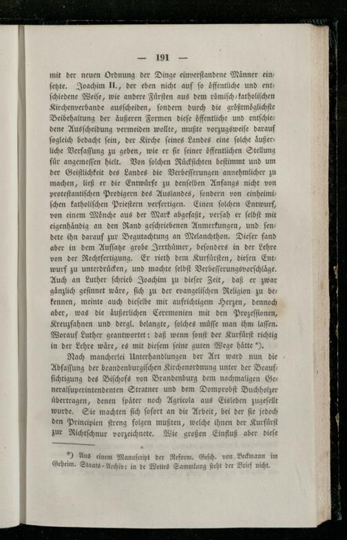 mit der neuen Ordnung der Dinge einverſtandene Maͤnner ein— ſetzte. Joachim II., der eben nicht auf ſo oͤffentliche und ent— ſchiedene Weiſe, wie andere Fuͤrſten aus dem roͤmiſch-katholiſchen Kirchenverbande ausſcheiden, ſondern durch die groͤßtmoͤglichſte Beibehaltung der äußeren Formen dieſe oͤffentliche und entſchiedene Ausſcheidung vermeiden wollte, mußte vorzugsweiſe darauf ſogleich bedacht ſein, der Kirche ſeines Landes eine ſolche aͤußer— liche Verfaſſung zu geben, wie er fie feiner oͤffentlichen Stellung fuͤr angemeſſen hielt. Von ſolchen Ruͤckſichten beſtimmt und um der Geiſtlichkeit des Landes die Verbeſſerungen annehmlicher zu machen, ließ er die Entwuͤrfe zu denſelben Anfangs nicht von proteſtantiſchen Predigern des Auslandes, ſondern von einheimi— ſchen katholiſchen Prieſtern verfertigen. Einen ſolchen Entwurf, von einem Moͤnche aus der Mark abgefaßt, verſah er ſelbſt mit eigenhändig an den Rand geſchriebenen Anmerkungen, und ſen— dete ihn darauf zur Begutachtung an Melanchthon. Dieſer fand aber in dem Aufſatze grobe Irrthuͤmer, beſonders in der Lehre von der Rechtfertigung. Er rieth dem Kurfuͤrſten, dieſen Ent— wurf zu unterdruͤcken, und machte ſelbſt Verbeſſerungsvorſchlaͤge. Auch an Luther ſchrieb Joachim zu dieſer Zeit, daß er zwar gänzlich geſinnet wäre, ſich zu der evangeliſchen Religion zu bes kennen, meinte auch dieſelbe mit aufrichtigem Herzen, dennoch aber, was die aͤußerlichen Ceremonien mit den Prozeſſionen, Kreuzfahnen und dergl. belangte, ſolches muͤſſe man ihm laſſen. Worauf Luther geantwortet: daß wenn ſonſt der Kurfuͤrſt richtig in der Lehre wäre, es mit dieſem feine guten Wege Hätte 9.