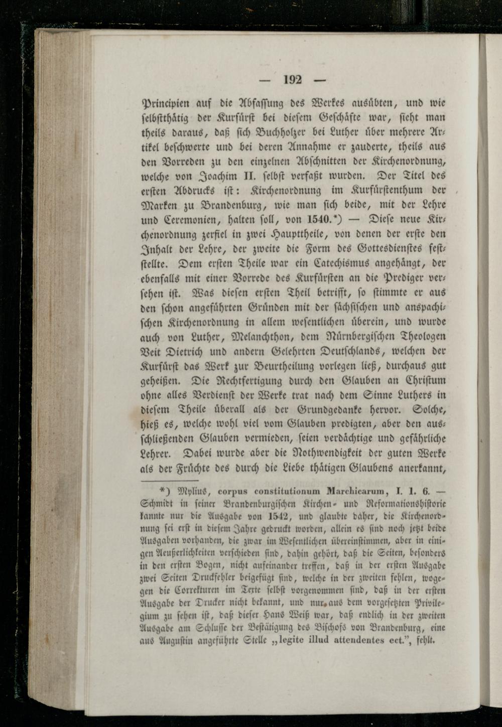 *) Mylius, corpus constitutionum Marchicarum, JI. 1. 6.— Schmidt in feiner Brandenburgiſchen Kirchen- und Reformationshiſtorie kannte nur die Ausgabe von 1542, und glaubte daher, die Kirchenordnung ſei erſt in dieſem Jahre gedruckt worden, allein es ſind noch jetzt beide Ausgaben vorhanden, die zwar im Weſentlichen übereinſtimmen, aber in einigen Aeußerlichkeiten verſchieden ſind, dahin gehört, daß die Seiten, beſonders in den erſten Bogen, nicht aufeinander treffen, daß in der erſten Ausgabe zwei Seiten Druckfehler beigefügt ſind, welche in der zweiten fehlen, woge gen die Correkturen im Texte ſelbſt vorgenommen ſind, daß in der erſten Ausgabe der Drucker nicht bekannt, und nur, aus dem vorgeſetzten Privile gium zu ſehen iſt, daß dieſer Hans Weiß war, daß endlich in der zweiten Ausgabe am Schluſſe der Beſtätigung des Biſchofs von Brandenburg, eine