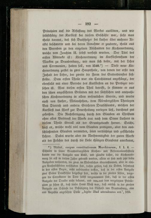 Principien auf die Abfaſſung des Werkes ausuͤbten, und wie ſelbſtthaͤtig der Kurfuͤrſt bei dieſem Geſchaͤfte war, ſieht man theils daraus, daß ſich Buchholzer bei Luther uͤber mehrere Ar— tikel beſchwerte und bei deren Annahme er zauderte, theils aus den Vorreden zu den einzelnen Abſchnitten der Kirchenordnung, welche von Joachim II. ſelbſt verfaßt wurden. Der Titel des erſten Abdrucks iſt: Kirchenordnung im Kurfuͤrſtenthum der