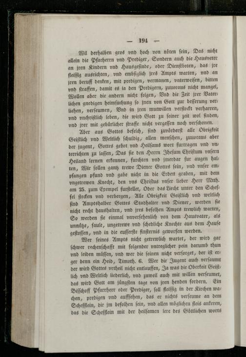 Aber aus Gottes befelch, find zuvoͤrderſt alle Obrigkeit Geiſtlich vnd Weltlich ſchuldig, allen menſchen, zuuoraus aber der jugent, Gottes gebot vnd Heilſams wort furtragen vnd vn— terrichten zu laſſen, Das fie den Herrn Iheſum Chriſtum vnſern Heiland lernen erkennen, furchten vnd jmerdar fur augen hal ten, Wir ſollen gantz trewe Diener Gottes ſein, vnd vnſer em— pfangen pfund vnd gabe nicht in die Erden graben, mit dem vngetrewen Knecht, den vns Chriſtus vnſer lieber Herr Mtth. am 25. zum Exempel furſtellet, Oder das Liecht unter den Schef— fel ſtecken vnd verbergen, Alle Obrigkeit Geiſtlich vnd weltlich ſind Amptshalber Gottes Stadhalter vnd Diener, werden ſie nicht recht haushalten, vnd jres befolhen Ampts trewlich warten, So werden ſie einmal vnverſehenlich von dem Hausvater, als unnuͤtze, faule, ungetrewe vnd ſchedliche Knechte aus dem Hauſe geſtoſſen, vnd in die euſſerſte finſternis geworfen werden.