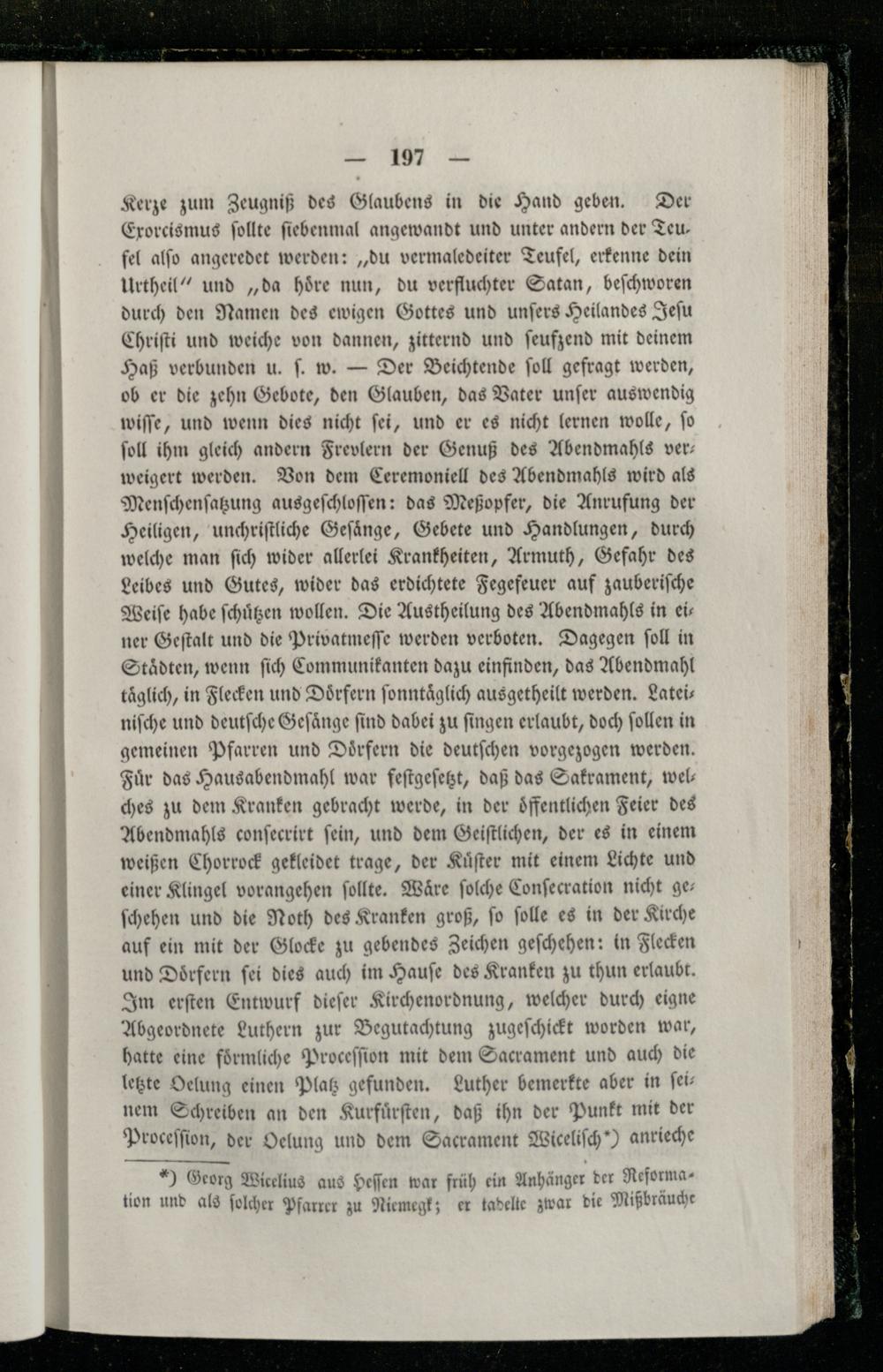 Kerze zum Zeugniß des Glaubens in die Hand geben. Der Exorcismus ſollte ſiebenmal angewandt und unter andern der Teufel alſo angeredet werden:„du vermaledeiter Teufel, erkenne dein Urtheil“ und„da Höre nun, du verfluchter Satan, beſchworen durch den Namen des ewigen Gottes und unſers Heilandes Jeſu Chriſti und weiche von dannen, zitternd und ſeufzend mit deinem Haß verbunden u. ſ. w.— Der Beichtende ſoll gefragt werden, ob er die zehn Gebote, den Glauben, das Vater unſer auswendig wiſſe, und wenn dies nicht ſei, und er es nicht lernen wolle, ſo ſoll ihm gleich andern Frevlern der Genuß des Abendmahls ver— weigert werden. Von dem Ceremoniell des Abendmahls wird als Menſchenſatzung ausgeſchloſſen: das Meßopfer, die Anrufung der Heiligen, unchriſtliche Geſaͤnge, Gebete und Handlungen, durch welche man ſich wider allerlei Krankheiten, Armuth, Gefahr des Leibes und Gutes, wider das erdichtete Fegefeuer auf zauberiſche Weiſe habe ſchuͤtzen wollen. Die Austheilung des Abendmahls in eis ner Geſtalt und die Privatmeſſe werden verboten. Dagegen ſoll in Staͤdten, wenn ſich Communikanten dazu einfinden, das Abendmahl taͤglich, in Flecken und Doͤrfern ſonntaͤglich ausgetheilt werden. Lateiniſche und deutſche Geſaͤnge ſind dabei zu ſingen erlaubt, doch ſollen in gemeinen Pfarren und Doͤrfern die deutſchen vorgezogen werden. Für das Hausabendmahl war feſtgeſetzt, daß das Sakrament, wel ches zu dem Kranken gebracht werde, in der oͤffentlichen Feier des Abendmahls conſecrirt ſein, und dem Geiſtlichen, der es in einem weißen Chorrock gekleidet trage, der Kuͤſter mit einem Lichte und einer Klingel vorangehen ſollte. Wäre ſolche Conſecration nicht ge ſchehen und die Noth des Kranken groß, ſo ſolle es in der Kirche auf ein mit der Glocke zu gebendes Zeichen geſchehen: in Flecken und Dörfern ſei dies auch im Haufe des Kranken zu thun erlaubt. Im erſten Entwurf dieſer Kirchenordnung, welcher durch eigne Abgeordnete Luthern zur Begutachtung zugeſchickt worden war, hatte eine foͤrmliche Proceſſion mit dem Sacrament und auch die letzte Oelung einen Platz gefunden. Luther bemerkte aber in ſei— nem Schreiben an den Kurfuͤrſten, daß ihn der Punkt mit der Proceſſion, der Oelung und dem Sacrament Wiceliſch‘) anrieche