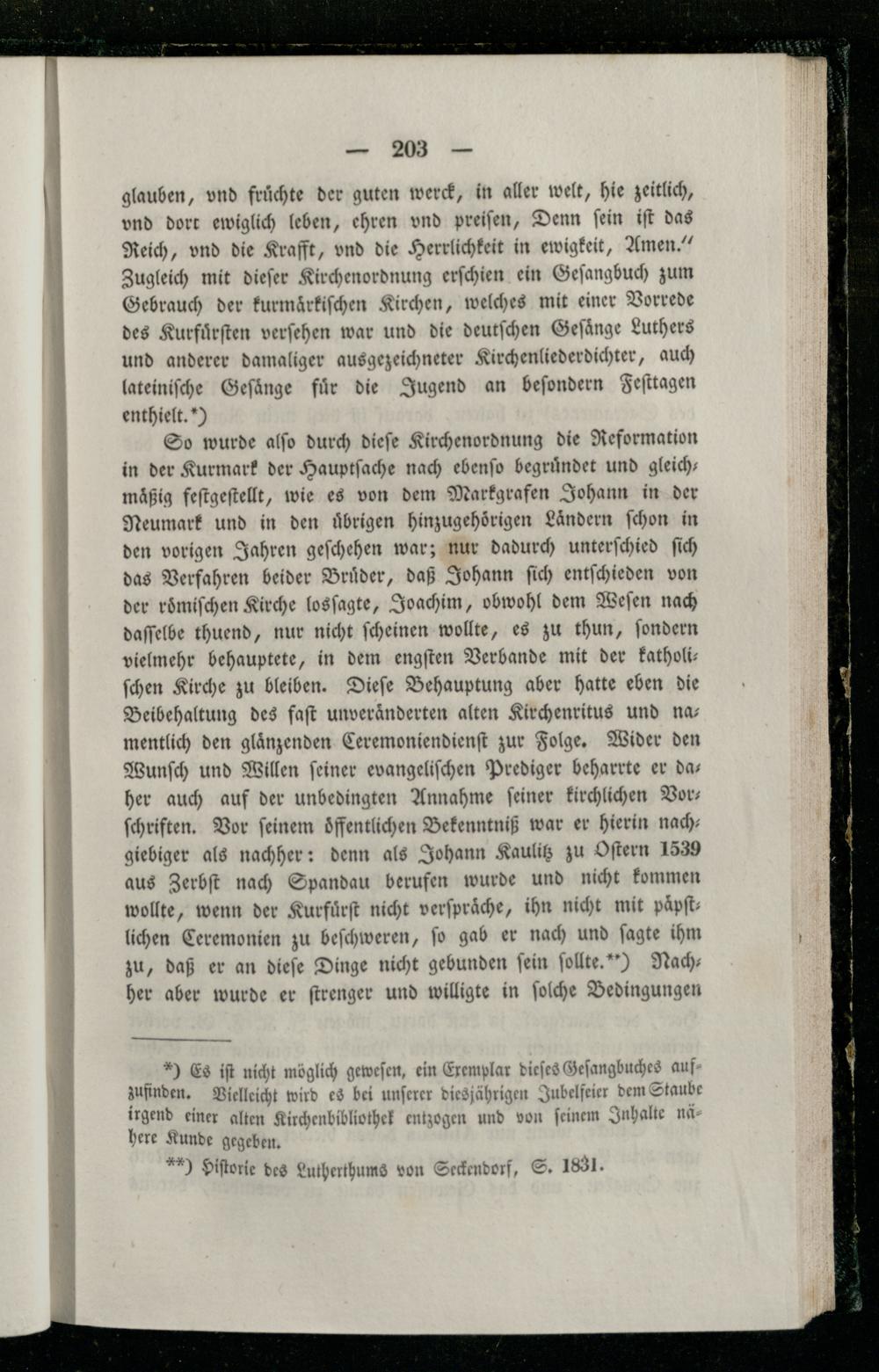 glauben, vnd fruͤchte der guten werck, in aller welt, hie zeitlich, vnd dort ewiglich leben, ehren vnd preiſen, Denn ſein iſt das Reich, vnd die Krafft, vnd die Herrlichkeit in ewigkeit, Amen.“ Zugleich mit dieſer Kirchenordnung erſchien ein Geſangbuch zum Gebrauch der kurmaͤrkiſchen Kirchen, welches mit einer Vorrede des Kurfuͤrſten verſehen war und die deutſchen Geſaͤnge Luthers und anderer damaliger ausgezeichneter Kirchenliederdichter, auch lateiniſche Geſaͤnge fuͤr die Jugend an beſondern Feſttagen enthielt.)