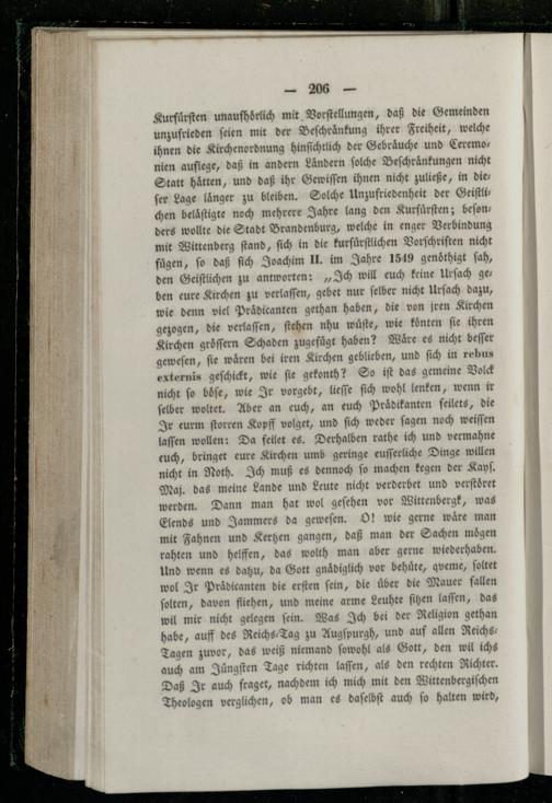 Kurfuͤrſten unaufhoͤrlich mit Vorſtellungen, daß die Gemeinden unzufrieden ſeien mit der Beschränkung ihrer Freiheit, welche ihnen die Kirchenordnung hinſichtlich der Gebräuche und Ceremonien auflege, daß in andern Landern ſolche Beſchränkungen nicht Statt hätten, und daß ihr Gewiſſen ihnen nicht zuließe, in dies ſer Lage laͤnger zu bleiben. Solche Unzufriedenheit der Geiſtlichen belaͤſtigte noch mehrere Jahre lang den Kurfuͤrſten; beſonders wollte die Stadt Brandenburg, welche in enger Verbindung mit Wittenberg ſtand, ſich in die kurfuͤrſtlichen Vorſchriſten nicht fuͤgen, ſo daß ſich Joachim II. im Jahre 1549 genöthigt ſah, den Geiſtlichen zu antworten:„Ich will euch keine Urſach ge— ben eure Kirchen zu verlaſſen, gebet nur ſelber nicht Urſach dazu, wie denn viel Prädicanten gethan haben, die von jren Kirchen gezogen, die verlaſſen, ſtehen nhu wuͤſte, wie konten fie ihren Kirchen groͤſſern Schaden zugefuͤgt haben? Waͤre es nicht beſſer geweſen, ſie wären bei iren Kirchen geblieben, und ſich in rebus externis geſchickt, wie fie gekonth? So iſt das gemeine Volck nicht ſo boͤſe, wie Ir vorgebt, lieſſe ſich wohl lenken, wenn ir ſelber woltet. Aber an euch, an euch Praͤdikanten feilets, die Ir eurm ſtorren Kopff volget, und ſich weder ſagen noch weiſſen laſſen wollen: Da feilet es. Derhalben rathe ich und vermahne euch, bringet eure Kirchen umb geringe euſſerliche Dinge willen nicht in Noth. Ich muß es dennoch ſo machen kegen der Kayſ. Maj. das meine Lande und Leute nicht verderbet und verſtoͤret werden. Dann man hat wol geſehen vor Wittenbergk, was Elends und Jammers da geweſen. O! wie gerne waͤre man mit Fahnen und Kertzen gangen, daß man der Sachen moͤgen rahten und helffen, das wolth man aber gerne wiederhaben. Und wenn es datzu, da Gott gnaͤdiglich vor behuͤte, qveme, ſoltet wol Ir Praͤdicanten die erſten ſein, die über die Mauer fallen ſolten, davon fliehen, und meine arme Leuhte ſitzen laſſen, das wil mir nicht gelegen ſein. Was Ich bei der Religion gethan habe, auff des Reichs⸗Tag zu Augſpurgh, und auf allen Reichs Tagen zuvor, das weiß niemand ſowohl als Gott, den wil ichs auch am Jungſten Tage richten laſſen, als den rechten Richter. Daß Ir auch fraget, nachdem ich mich mit den Wittenbergiſchen Theologen verglichen, ob man es daſelbſt auch ſo halten wird,