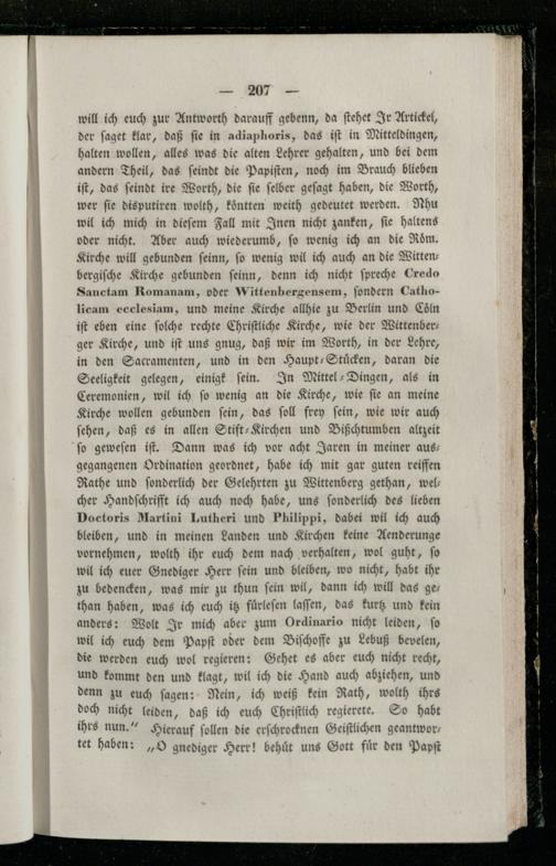will ich euch zur Antworth darauff gebenn, da ſtehet Ir Artickel, der ſaget klar, daß ſie in adiaphoris, das iſt in Mitteldingen, halten wollen, alles was die alten Lehrer gehalten, und bei dem andern Theil, das ſeindt die Papiſten, noch im Brauch blieben iſt, das ſeindt ire Worth, die ſie ſelber geſagt haben, die Worth, wer ſie disputiren wolth, koͤntten weith gedeutet werden. Nhu wil ich mich in dieſem Fall mit Inen nicht zanken, ſie haltens oder nicht. Aber auch wiederumb, ſo wenig ich an die Roͤm. Kirche will gebunden ſeinn, ſo wenig wil ich auch an die Witten— bergiſche Kirche gebunden ſeinn, denn ich nicht ſpreche Credo Sanctam Romanam, oder Wittenbergensem, ſondern Catholicam ecelesiam, und meine Kirche allhie zu Berlin und Coͤln iſt eben eine ſolche rechte Chriſtliche Kirche, wie der Wittenber— ger Kirche, und iſt uns gnug, daß wir im Worth, in der Lehre, in den Sacramenten, und in den Haupt-Stuͤcken, daran die Seeligkeit gelegen, einigk ſein. In Mittel-Dingen, als in Ceremonien, wil ich ſo wenig an die Kirche, wie ſie an meine Kirche wollen gebunden ſein, das ſoll frey ſein, wie wir auch ſehen, daß es in allen Stift-Kirchen und Bißchtumben altzeit ſo geweſen iſt. Dann was ich vor acht Jaren in meiner aus— gegangenen Ordination geordnet, habe ich mit gar guten reiffen Rathe und ſonderlich der Gelehrten zu Wittenberg gethan, wel— cher Handſchrifft ich auch noch habe, uns ſonderlich des lieben Doctoris Martini Lutheri und Philippi, dabei wil ich auch bleiben, und in meinen Landen und Kirchen keine Aenderunge vornehmen, wolth ihr euch dem nach verhalten, wol guht, ſo wil ich euer Gnediger Herr ſein und bleiben, wo nicht, habt ihr zu bedencken, was mir zu thun ſein wil, dann ich will das ge— than haben, was ich euch itz fuͤrleſen laſſen, das kurtz und kein anders: Wolt Ir mich aber zum Ordinario nicht leiden, ſo wil ich euch dem Papſt oder dem Biſchoffe zu Lebuß bevelen, die werden euch wol regieren: Gehet es aber euch nicht recht, und kommt den und klagt, wil ich die Hand auch abziehen, und denn zu euch ſagen: Nein, ich weiß kein Rath, wolth ihrs doch nicht leiden, daß ich euch Chriſtlich regierete. So habt ihrs nun.“ Hierauf ſollen die erſchrocknen Geiſtlichen geantwor— tet haben:„O gnediger Herr! behuͤt uns Gott fuͤr den Papſt