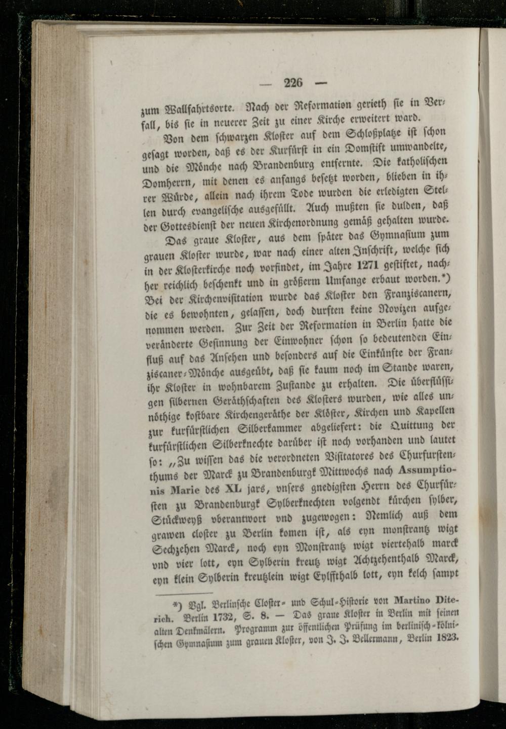 grauen Kloſter wurde, war nach einer alten Inſchrift, welche ſich in der Kloſterkirche noch vorfindet, im Jahre 1271 geſtiftet, nachher reichlich beſchenkt und in groͤßerm Umfange erbaut worden.) Bei der Kirchenviſitation wurde das Kloſter den Franziscanern, die es bewohnten, gelaſſen, doch durften keine Novizen aufgenommen werden. Zur Zeit der Reformation in Berlin hatte die veränderte Geſinnung der Einwohner ſchon fo bedeutenden Einfluß auf das Anſehen und beſonders auf die Einkünfte der Franziscaner⸗Mönche ausgeübt, daß fie kaum noch im Stande waren, ihr Kloſter in wohnbarem Zuſtande zu erhalten. Die überfluͤſſigen ſilbernen Gerathſchaften des Kloſters wurden, wie alles un— nöthige koſtbare Kirchengeraͤthe der Kloͤſter, Kirchen und Kapellen zur kurfuͤrſtlichen Silberkammer abgeliefert: die Quittung der kurfuͤrſtlichen Silberknechte daruͤber iſt noch vorhanden und lautet ſo:„Zu wiſſen das die verordneten Viſitatores des Churfurſtenthums der Marck zu Brandenburgk Mittwochs nach Assumptio nis Marie des XL jars, vnſers gnedigſten Herrn des Churfuͤrſten zu Brandenburgk Sylberknechten volgendt kuͤrchen ſylber, Stuͤckweyß vberantwort vnd zugewogen: Nemlich auß dem grawen cloſter zu Berlin komen iſt, als eyn monſtrantz wigt Sechzehen Marck, noch eyn Monſtrantz wigt viertehalb marck vnd vier lott, eyn Sylberin kreutz wigt Achtzehenthalb Marck, eyn klein Sylberin kreutzlein wigt Eylffthalb lott, eyn kelch ſampt