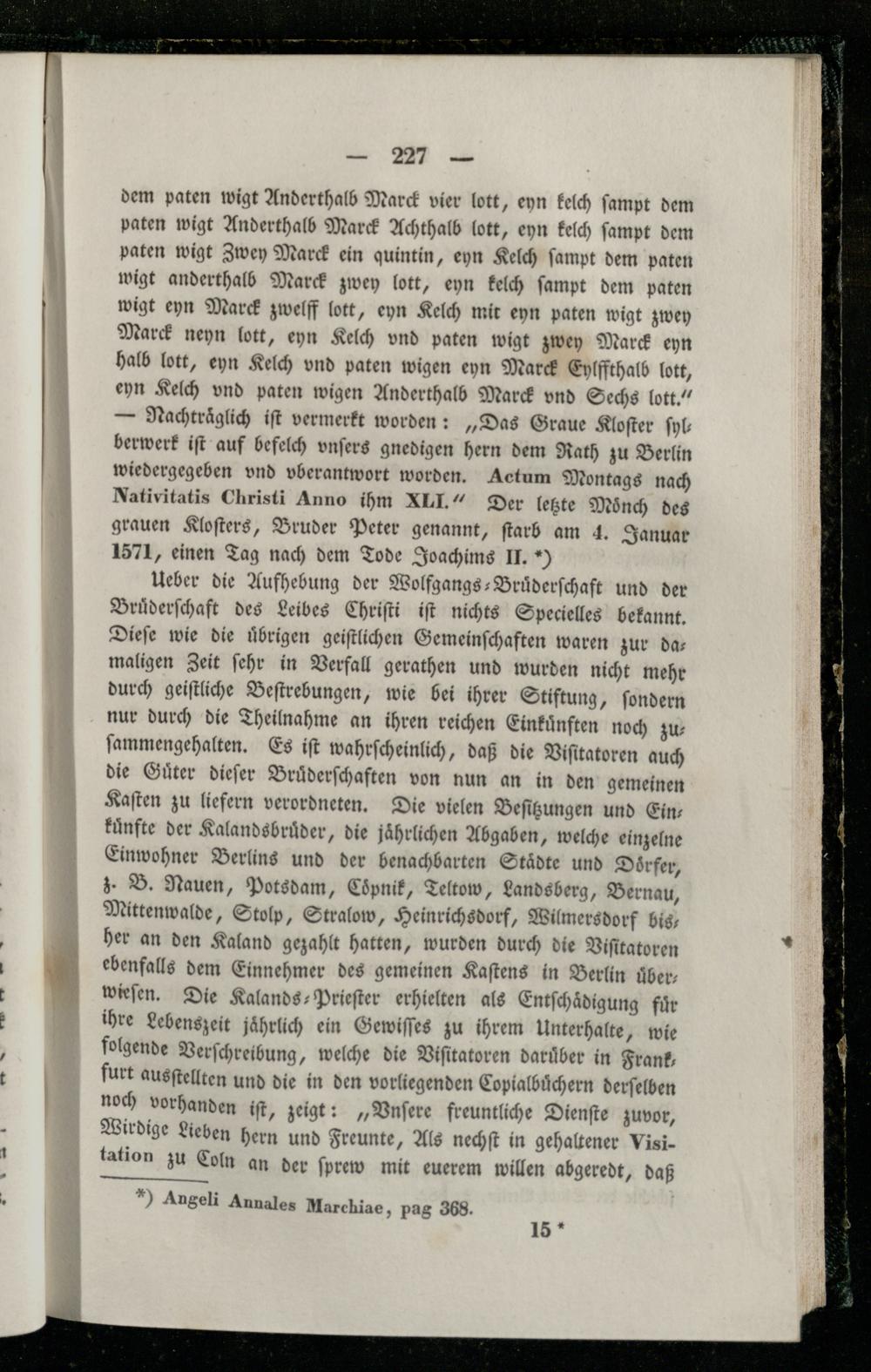 dem paten wigt Anderthalb Marck vier lott, eyn kelch ſampt dem paten wigt Anderthalb Marck Achthalb lott, eyn kelch ſampt dem paten wigt Zwey Marck ein quintin, eyn Kelch ſampt dem paten wigt anderthalb Marck zwey lott, eyn kelch ſampt dem paten wigt eyn Marck zwelff lott, eyn Kelch mit eyn paten wigt zwey Marck neyn lott, eyn Kelch vnd paten wigt zwey Marck eyn halb lott, eyn Kelch vnd paten wigen eyn Marck Eylffthalb lott, eyn Kelch vnd paten wigen Anderthalb Marck vnd Sechs lott.“ — Nachträglich iſt vermerkt worden:„Das Graue Kloſter ſylberwerk iſt auf befelch vnſers gnedigen hern dem Rath zu Berlin wiedergegeben vnd vberantwort worden. Actum Montags nach Nativitatis Christi Anno ihm XII.“ Der letzte Moͤnch des grauen Kloſters, Bruder Peter genannt, ſtarb am 4. Januar 1571, einen Tag nach dem Tode Joachims II.*)